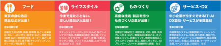 東京都内に事業所を有し、以下の4分野に該当する多彩な製品・サービスを扱う出展者約340の企業・団体が一堂に会します。最新の出展者一覧は、公式HP(https://bizchanexpo.tokyo)にてご確認いただけます。