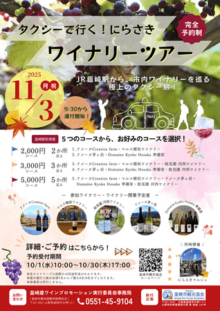 市内ワイナリー等をタクシーで巡り、にらさきワインのルーツやテロワールをお楽しみください。