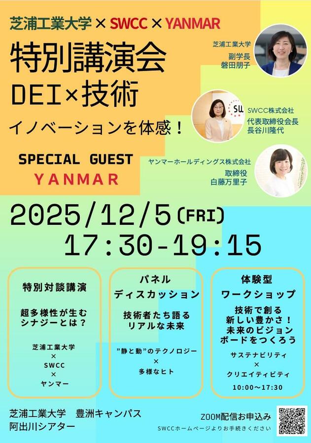 芝浦工業大学(東京都江東区/学長 山田純)とSWCC株式会社(神奈川県川崎市/代表取締役 CEO 社長執行役員 小又哲夫)は、芝浦工業大学豊洲キャンパスにてヤンマーホールディングス株式会社(大阪府大阪市/代表取締役社長 山岡健人)からゲストをお招きし、特別講演会:DEI×技術がイノベーションを創出することを体感しよう!「芝浦工業大学×SWCC×ヤンマーでシナジーを生む」を開催いたします。