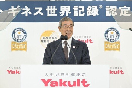 セレモニーは、「ヤクルト」ブランドの90年の歩みをまとめたオープニング映像からスタート。1935年の創業以来、研究と挑戦を重ね、日本を含む世界40の国と地域で愛されるブランドとなった歴史を振り返りました。続いて登壇した代表取締役社長 成田 裕は、「今回の『ギネス世界記録™』認定は、これまでの歩みの成果であると同時に、未来への大きな励みでもあります。ヤクルトグループはこれからも、世界中の人々の健康で楽しい生活づくりに貢献できるよう、挑戦を続けてまいります。本日はこのような栄誉をいただき、改めて皆さまに深く感謝申しあげます。今後とも、ヤクルトグループのさらなる成長にご期待いただければ幸いです。」と挨拶しました。