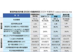 新潟市は、市の最上位計画「新潟市総合計画2030」について、2年目となる2024年度の進捗(しんちょく)状況をまとめた。全体の進捗を測る総合指標4項目のうち、転入と転出の差を示す「社会動態」が転入超過となり、目標達成への目安ラインを上回った=表参照=。一方で「合計特殊出生率」など3項目は届かなかった。