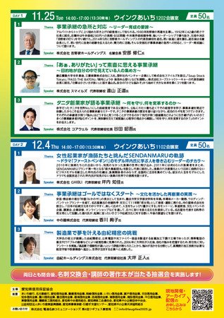 テレビドラマのモデルにもなった経営者をはじめ、各界の著名経営者の方々が名古屋に集結し、ここでしか聞けない創業・事業承継のリアルを熱く語ります。