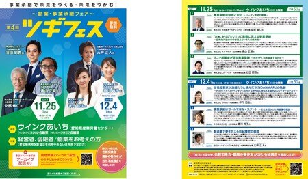 2025年11月25日(火)・12月4日(木)の2日間、事業承継・創業をお考えの方を対象とした創業・事業承継フェア「第4回ツギフェス」をウインクあいち(愛知県産業労働センター)にて開催いたします。