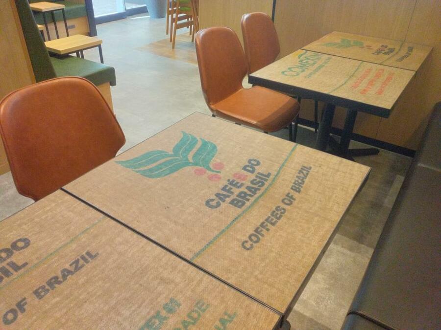 同店で使用している一部のテーブルには、当社の中部工場(愛知県春日井市)から排出された「麻袋」をアップサイクルし、サステナビリティの取り組みに訴求しています。当社では引き続き「麻袋」のアップサイクルの啓発活動を推進していくとともに、持続的なコーヒー生産の実現を目指した取り組みを進めてまいります。