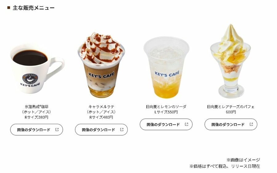 ドリンクは、まろやかな味わいが特徴の「氷温熟成®珈琲」をはじめ、同コーヒーを使用したアレンジメニューを多数取り揃えています。さらに、宮崎県が全国一の生産量を誇る日向夏を使用したオリジナルメニュー計4品を販売。日向夏ならではのさわやかな酸味と優しい甘みがお楽しみいただけます。店舗で販売するメニューは一部商品を除き、テイクアウトも可能です。