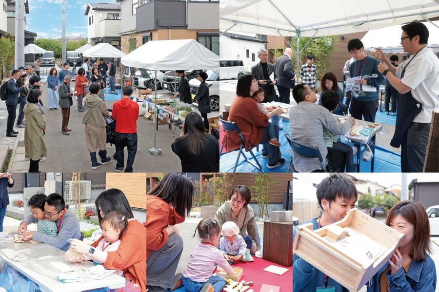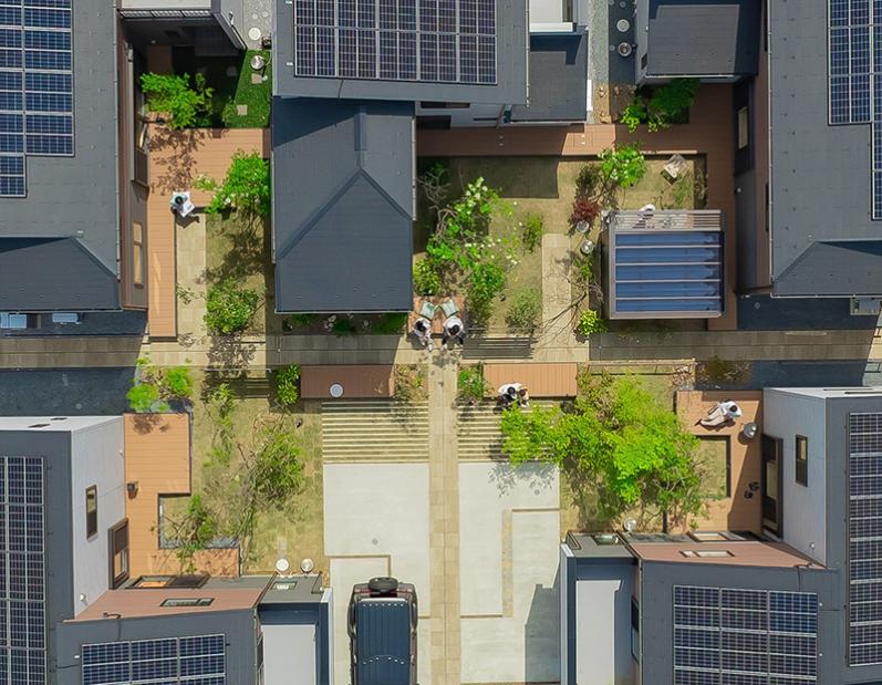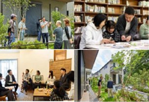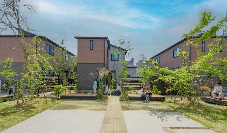 従来の分譲住宅の枠組みを超え、地域と共に育む持続可能な暮らしを実現した先進的な取り組みである。既存の共同住宅を挟んだ2区画に全14棟を配置し、住まい手のみならず近隣住民や建材メーカー、富山県の生産者など多様な関係者が連携することで、地域に根差したコミュニティ形成を促進している。住宅の設計においては、家庭菜園付きテラスやベンチなどの中間領域を活用し、人と人との自然な交流を生み出す空間づくりが図られている。また、建材の生産背景を住まい手に直接伝えることで、住まいへの理解と愛着を深める「住宅のトレーサビリティ」を高める工夫も秀逸である。
