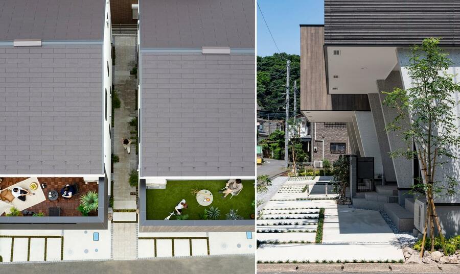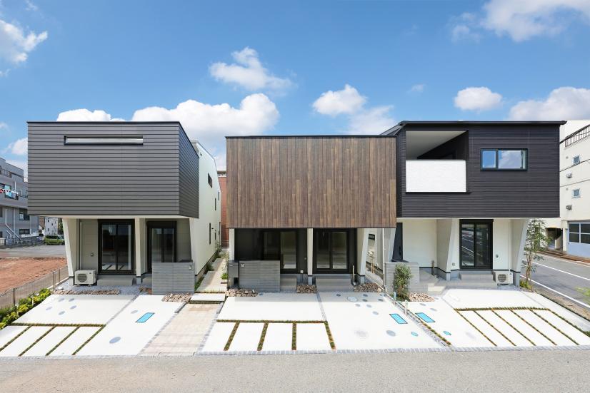 南側に道路が連続した計画地での分譲住宅です。従来型の配棟では、道路側に庭を取り、隣家同士の感覚は狭くなり、建物のファサード(正面の外観)が並んだだけの単調な街並みになってしまいます。本計画では、隣り合う2棟を1組にし、道路側のみならず建物の間にも、玄関へと通じる通り庭を設置。建物間隔を広げることで角地のような採光性を実現し、お隣さんと顔を合わせる機会が生まれてコミュニティを育むことができます。2棟1組のファサードと通り庭には3つの異なるテーマを設けて街区の中にも変化をもたらしました。