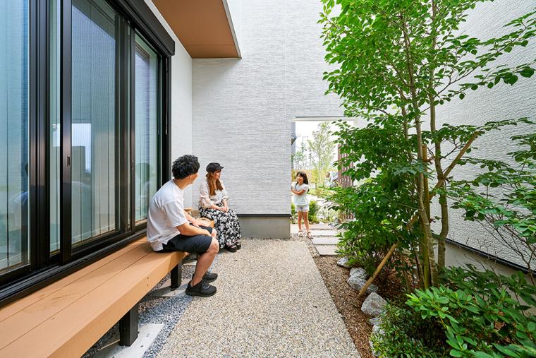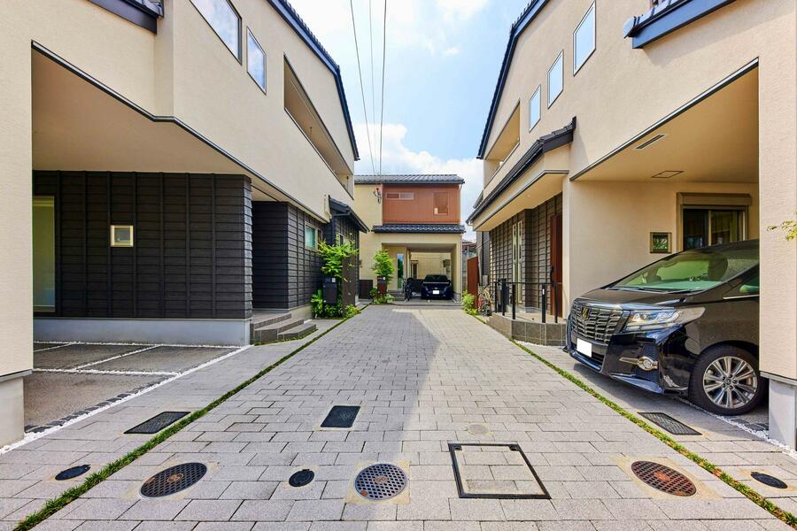 本分譲地は南北に道路が通る敷地条件で、通常の配棟では南側と北側に分断されて街としての一体感に乏しいものとなり、北側の区画の陽当たり不足も懸念されました。そこで、街区の中心に中庭を配置し、その周囲を取り囲むように5棟の住宅を配棟。各戸の陽当たりを確保しつつ、通常分断される庭が中心に集まることで、開放感・奥行き感も生まれます。「はなれ」や植栽の位置を程よく調整し、中庭からの目線にも配慮し、プライバシーにも対応したデザインとなっています。