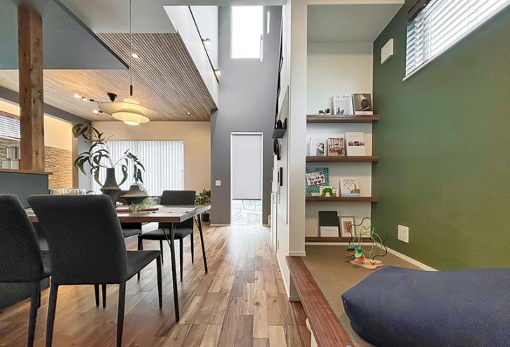 階段の踊り場を人が通過するだけではなく、居場所ととらえ本棚や読書スペースをつくることで、画一的なLDKではない奥行感や上下階をつなぐ場が生まれる優れた計画として評価した。多様な場は人々の経験や体験を豊かにする。例えば、お気に入りの本から、家族や友人とのコミュニケーションが生まれる可能性なども期待できる。本棚の上部には開口部を設けており、自然光が上部から降り注ぐことで、踊り場だけでなく上下階ともに明るい空間となり、開放的な広がりのある空間は丁寧なデザインが施された計画である。