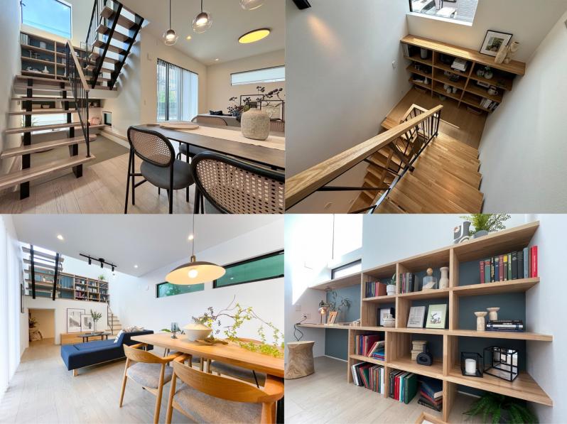 「子どもの本離れ」と言われますが、デジタルが接近したことで、本の方が子どものそばから離れていったのではないでしょうか?本物件は、子どもの身近な場所に本を取り戻すことをコンセプトにデザインされた分譲住宅です。子どもの手が届く一番良い場所として、南側の一番良い場所に配した吹き抜けの階段、その踊り場に造り付けの本棚を設置しました。階段は単なる動線ではなく、立ち止まり、光が差し込む中で階段に腰掛けて、リビングにいる家族の存在を感じながら本に触れられる場所になっています。