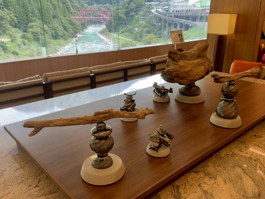 黒部・宇奈月温泉 やまのはの目の前を流れる黒部川や富山湾沿岸では、流木の発生やウニの異常繁殖といった自然環境に関わる課題が見られます。黒部川では雪解けや豪雨により毎年大量の流木が発生し、ダムや周辺施設への悪影響を防ぐため、国土交通省 北陸地方整備局 黒部河川事務所によって管理・回収が行われています。また、富山湾では、海流の変化などによりウニが過剰に繁殖し、生態系に深刻な影響を与えています。今回の企画では、河川や海域の環境管理の過程で回収された流木やウニ殻などの自然素材を活用し、アート作品を制作しました。