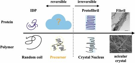 図1:天然変性タンパク質の線維化と高分子結晶との類似性。今回、タウタンパク質において前駆体クラスターを発見した。