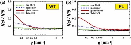 図2:野生型(WT)と変異型(P301L)のX線小角散乱の結果。ヘパリンを入れると、小角(qの小さい方)の散乱が大きくなっていることがわかった。これが前駆体クラスターに対応している。