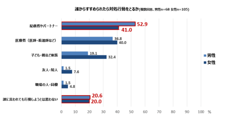 自覚症状を感じたときに誰からすすめられたら対処行動をとろうと思うかを聞いたところ、女性で最も多かったのは「配偶者やパートナー(41.0%)」、次いで「医療者(医師・看護師など)(40.0%)」でした。一方で、男性でも同様の項目が上位に並びますが、女性と比較して「配偶者やパートナー」が高く、「子供や親などの家族」「友人・知人」「職場の人・同僚」の影響力が低いことがわかりました。また、「誰に言われても行動しようとは思わない」人が5人に1人いました。このことからも、家族や身近な人どうしでの健康状態に関するコミュニケーションが、医療従事者からの働きかけと同じくらい重要な役割をはたしていることがわかりました。