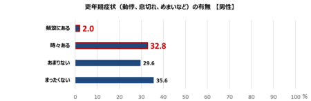 男性のうち、動悸や息切れ、めまいなどの自覚症状を感じている人が「頻繁にある」「時々ある」の合計で3人に1人(34.8%)いることがわかりました。