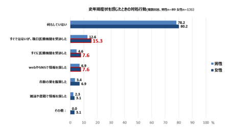対処行動をとった女性の中での上位回答は、「すぐにではないが、後日医療機関を受診した」が15.3%。次に「すぐに医療機関を受診した(7.6%)」「webやSNSで情報を探した(7.6%)」が続く。