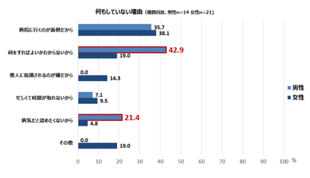 「何もしていない」と回答した人(女性)が、何もしない理由で最も多かった回答は「病院に行くのが面倒だから(38.1%)」、次に「何をすればよいかわからないから(19.0%)」「他人に指摘されるのが嫌だから(14.3%)」でした。