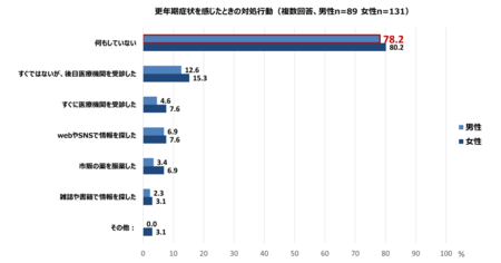 同様に対処行動の有無を確認したところ、女性と同様に約8割(78.2%)が何もしていないことがわかりました。実施した対処行動は「すぐではないが、後日医療機関を受診した」が12.6%と最も多く、男女における大きな差異はありませんでした。「何もしていない」理由でもっとも多かった回答は「何をすればよいかわからないから(42.9%)」で、女性との差異が23.9ポイントありました。また、三番目に高い「病気だと認めたくないから(21.4%)」では女性の4.8%と比較して16.6ポイントの差異があり、二つの回答で男女間の意識の違いが浮き彫りとなりました。
