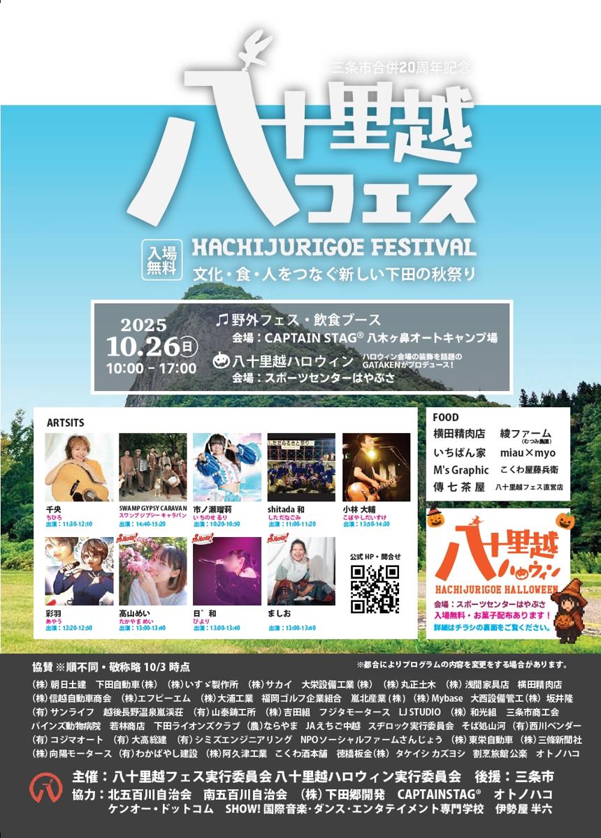 10月26日、下田地域のCAPTAIN STAG(キャプテンスタッグ)八木ケ鼻オートキャンプ場とスポーツセンターはやぶさ。イベントは午前10時〜午後5時。音楽ライブ、「ハロウィン仮装大賞」、下田産新米の試食など。[もっと詳しく]「八十里越フェス」三条市下田地域で10月26日初開催!音楽ライブに新米試食…道路開通への“第一歩”に