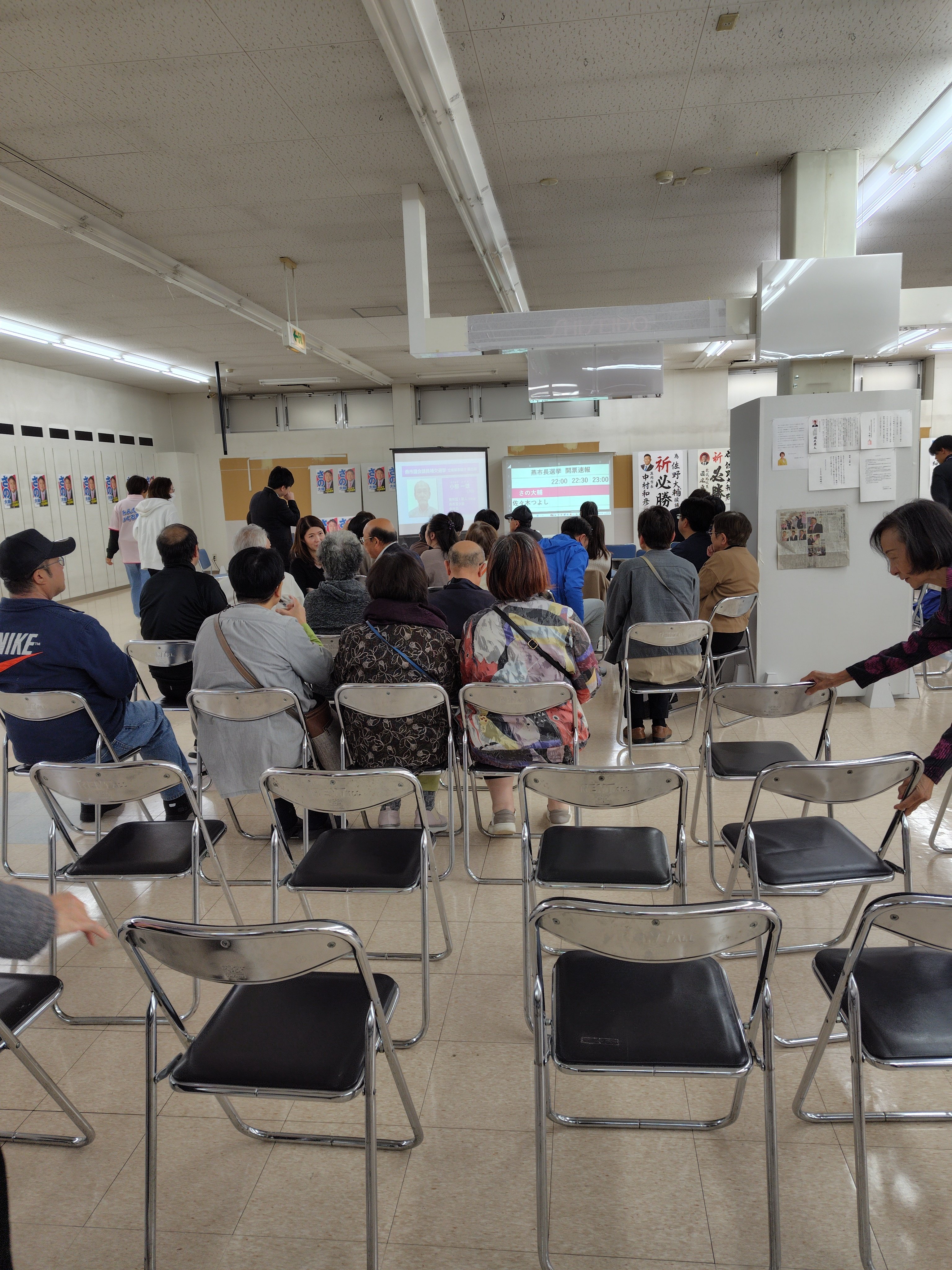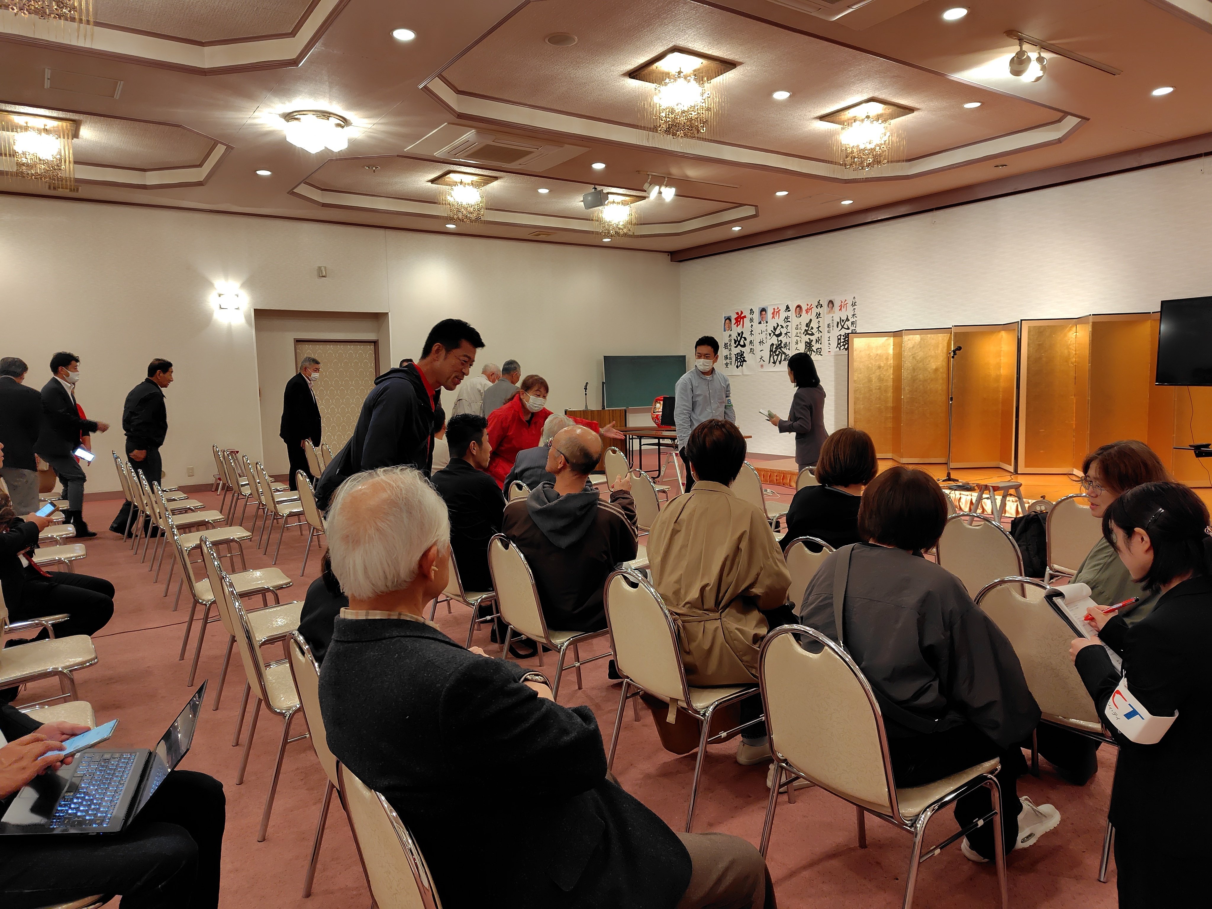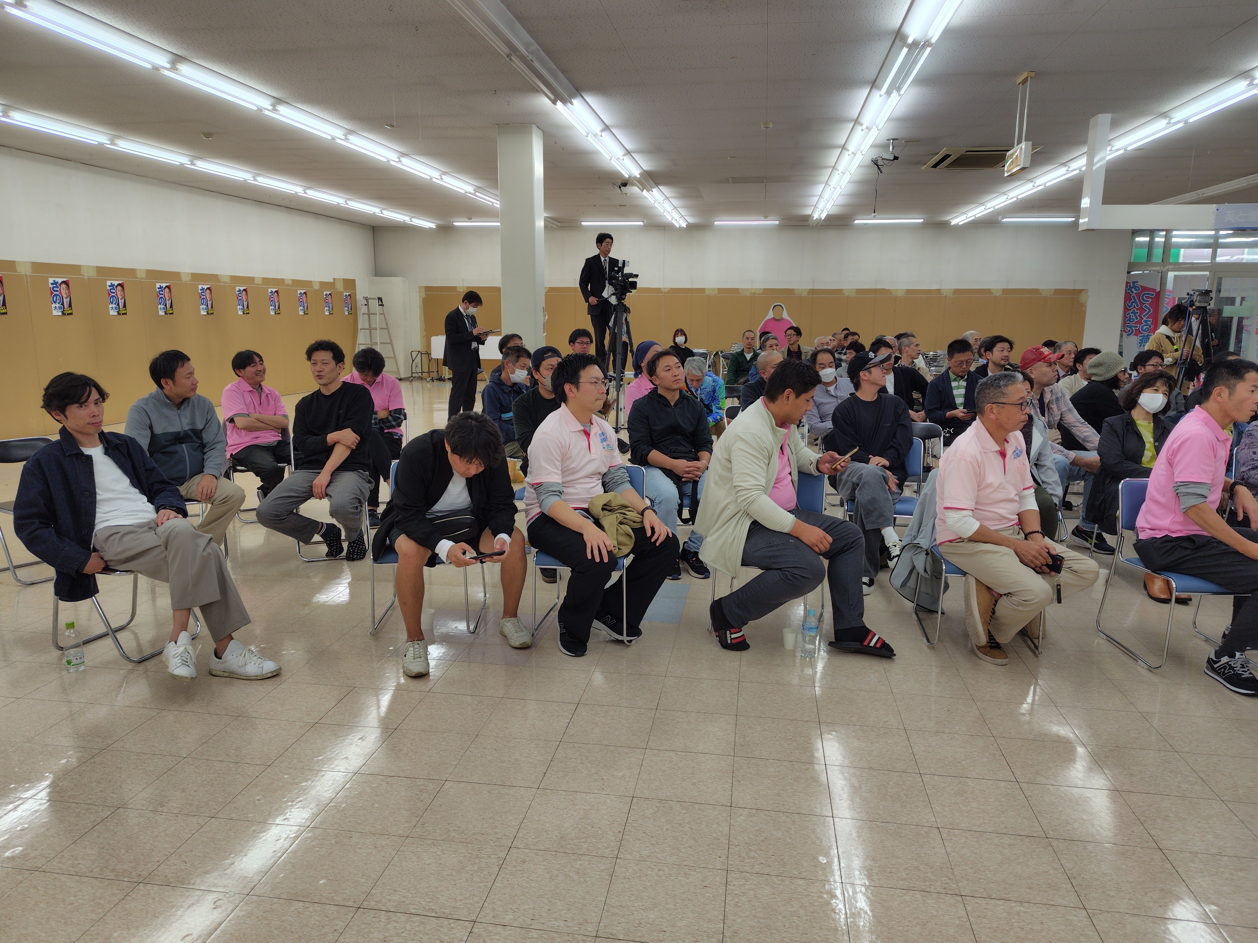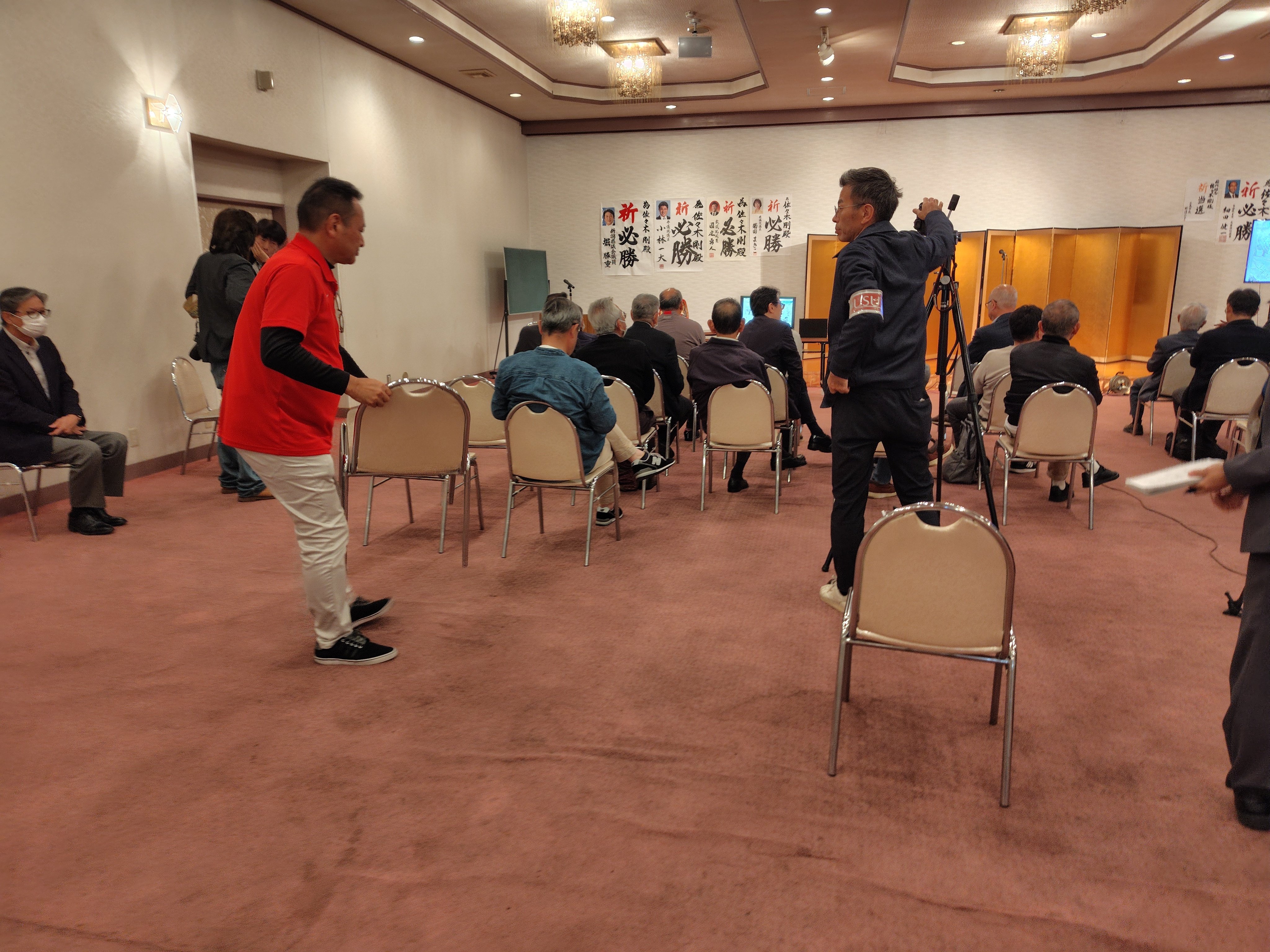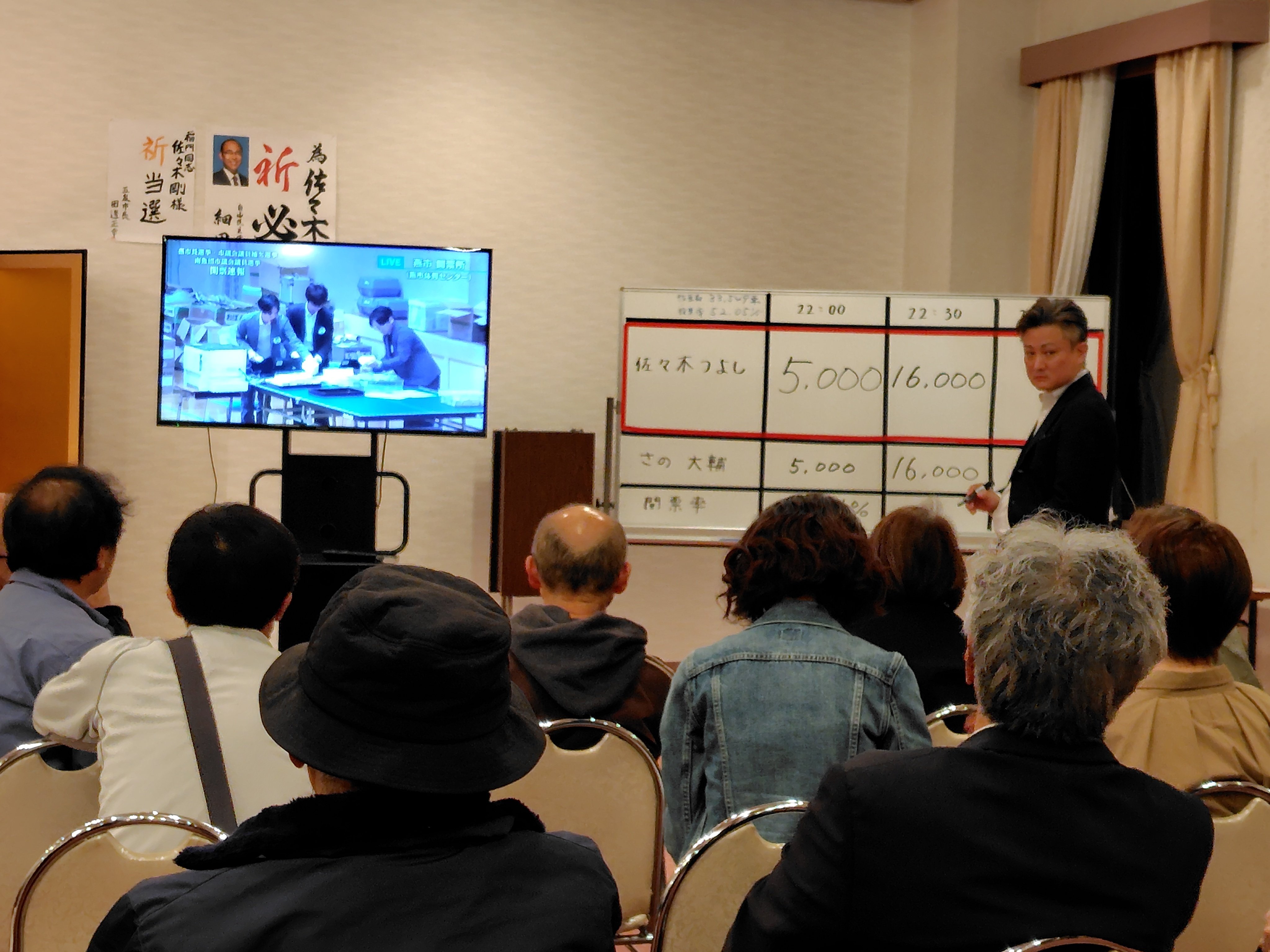支援者ら30人ほどが席に座り、中間発表を待っています。