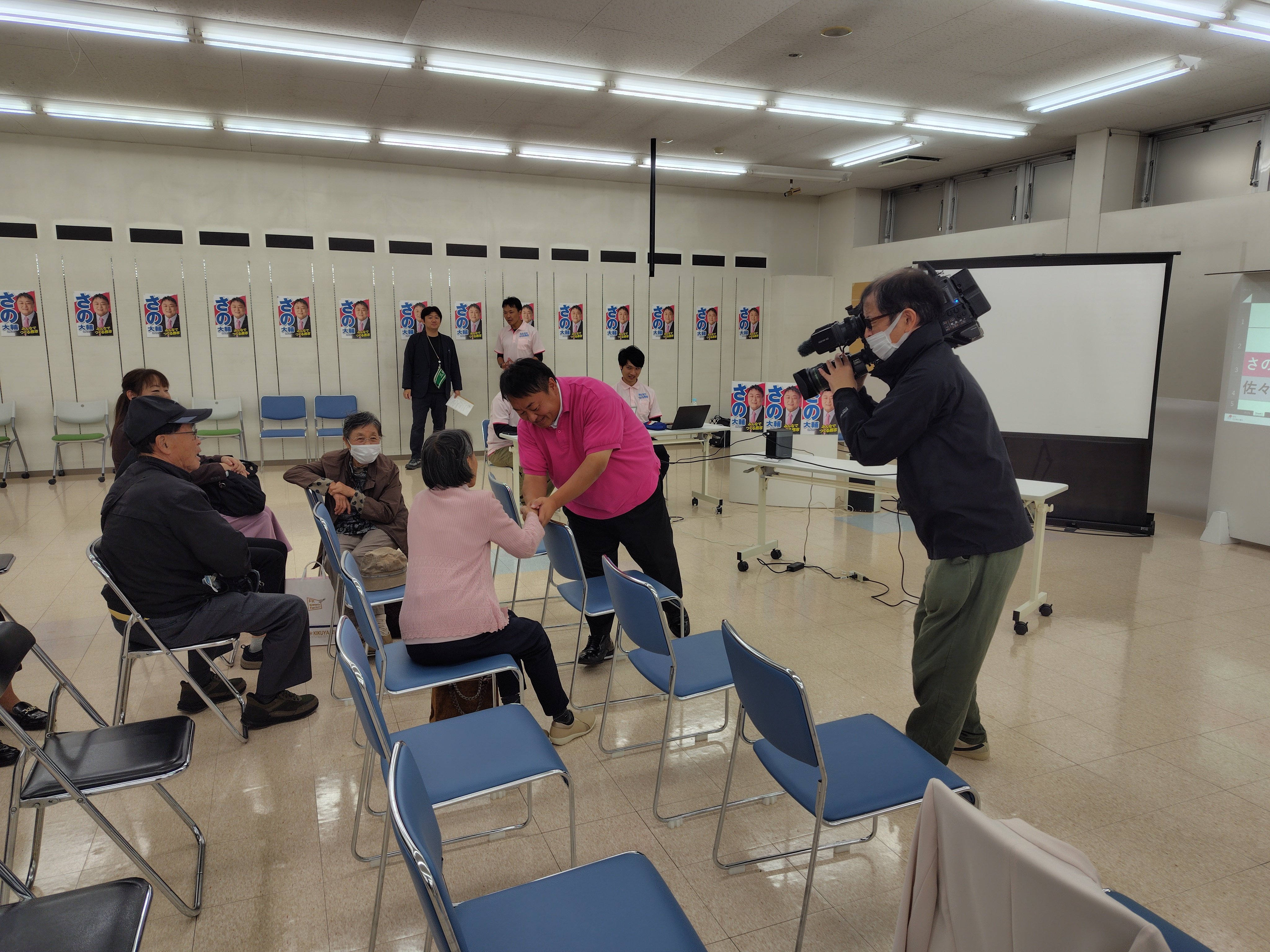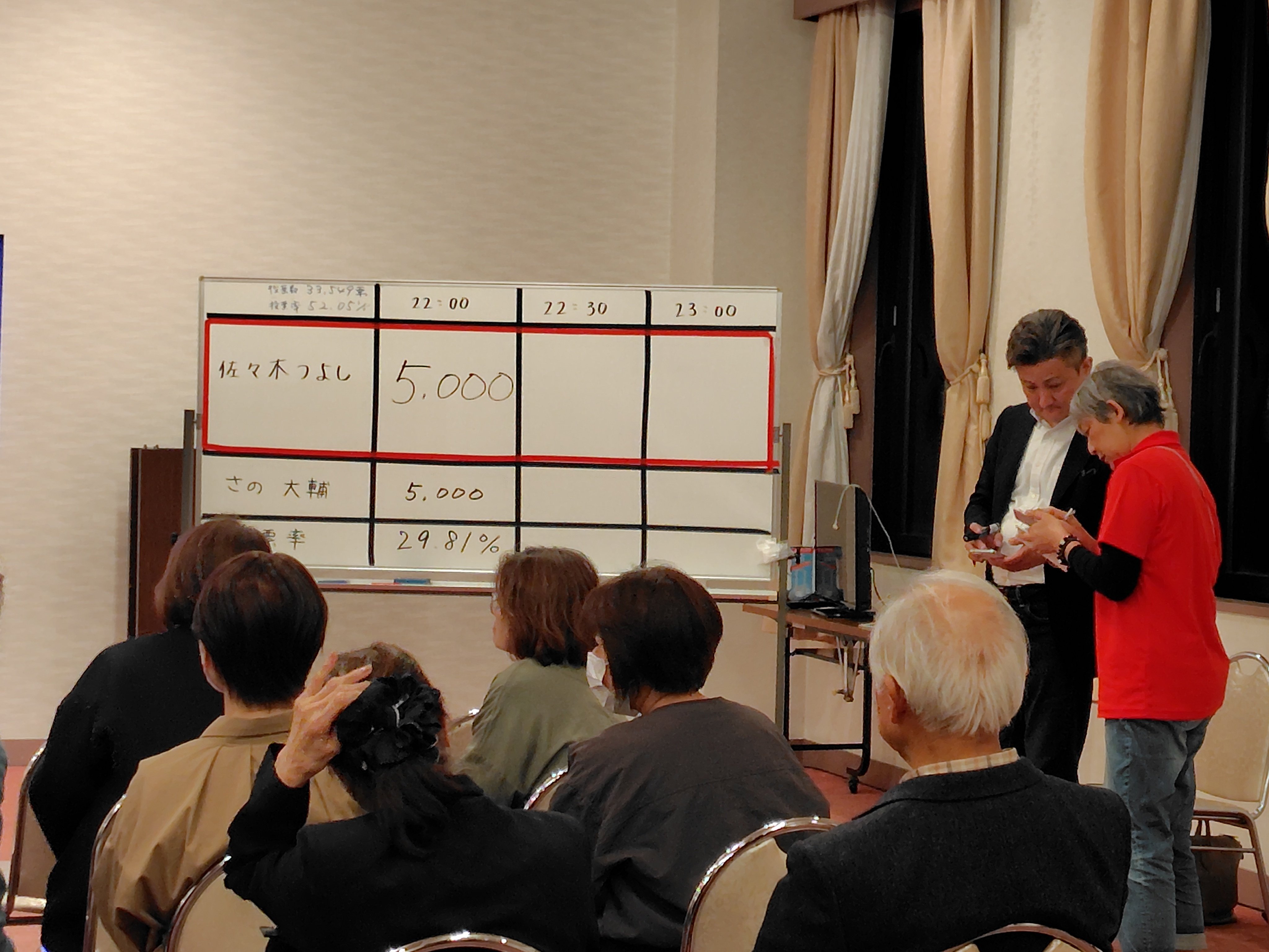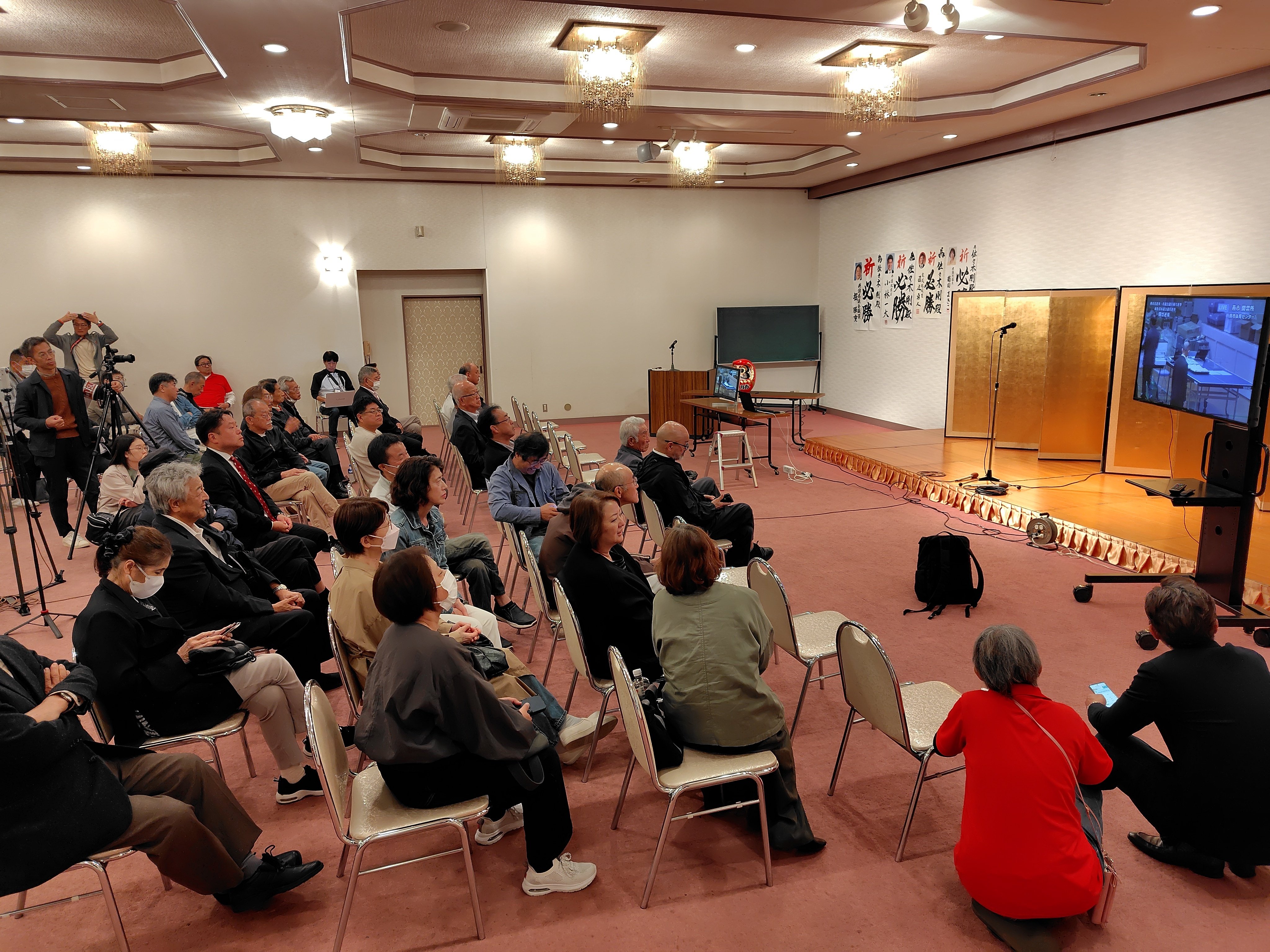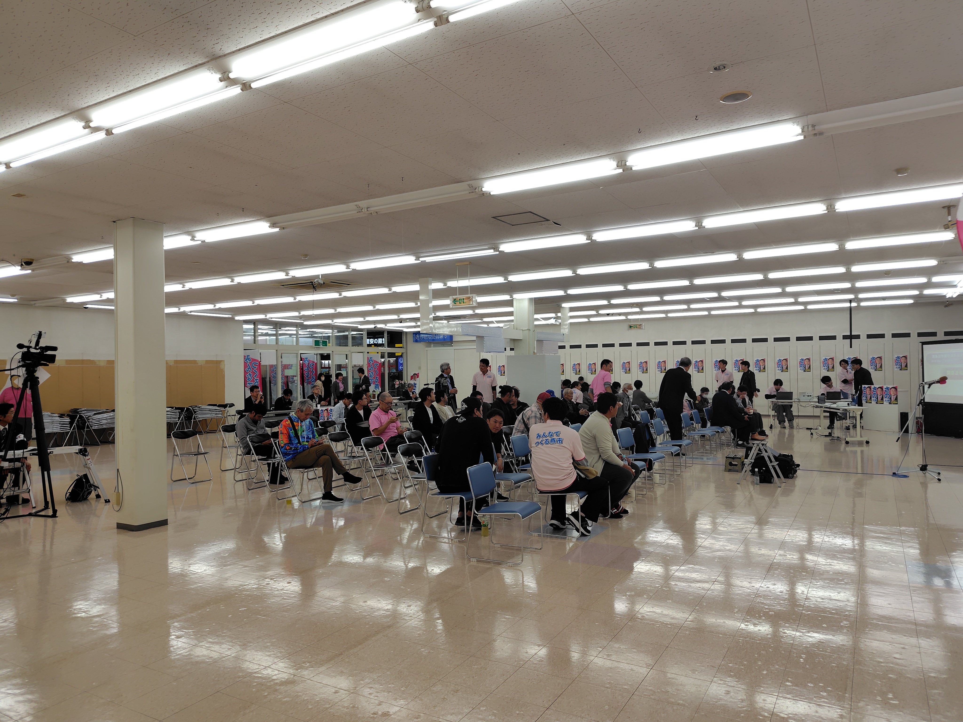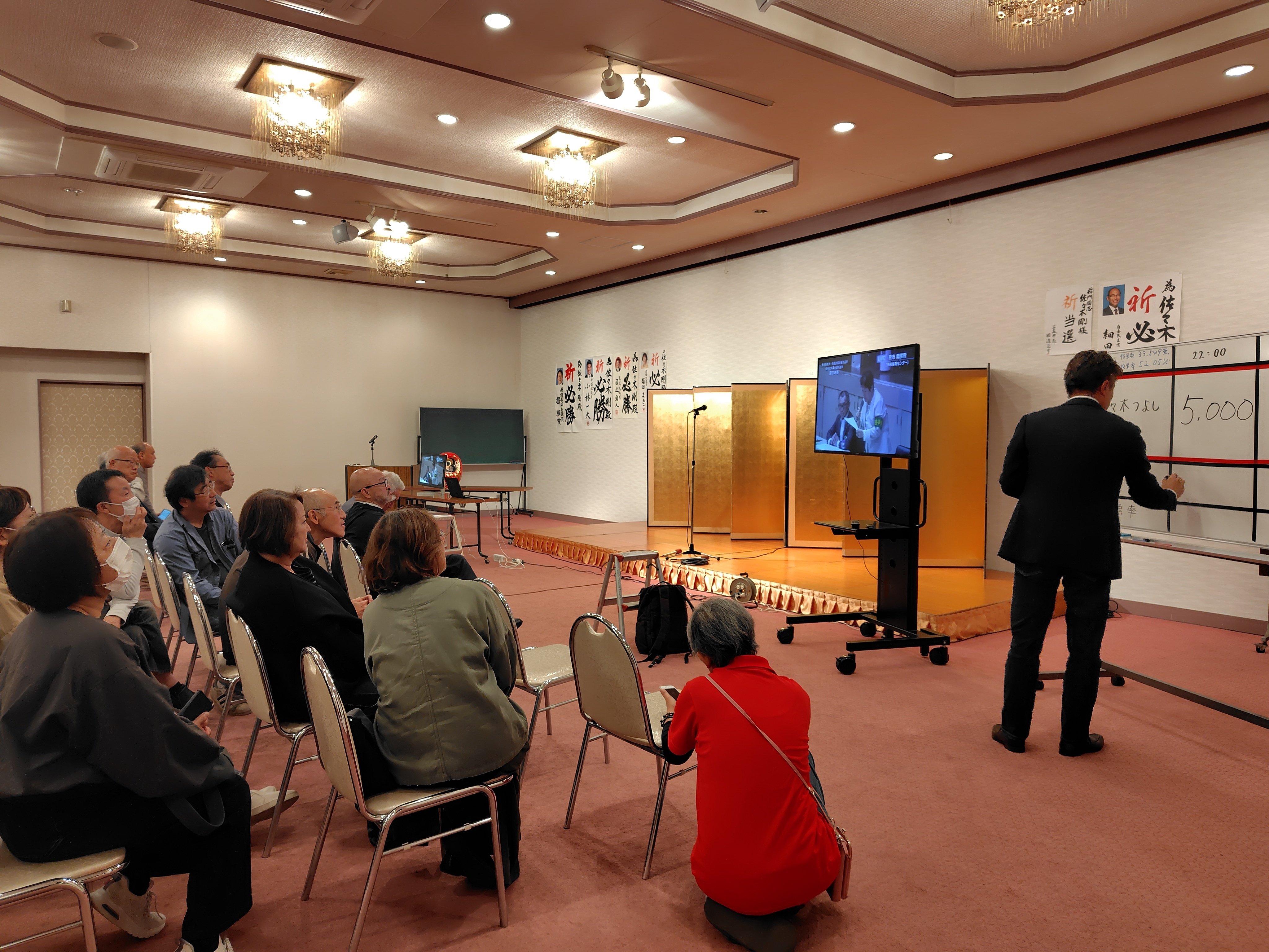 支援者ら30人ほどが席に座り、中間発表を待っています。
