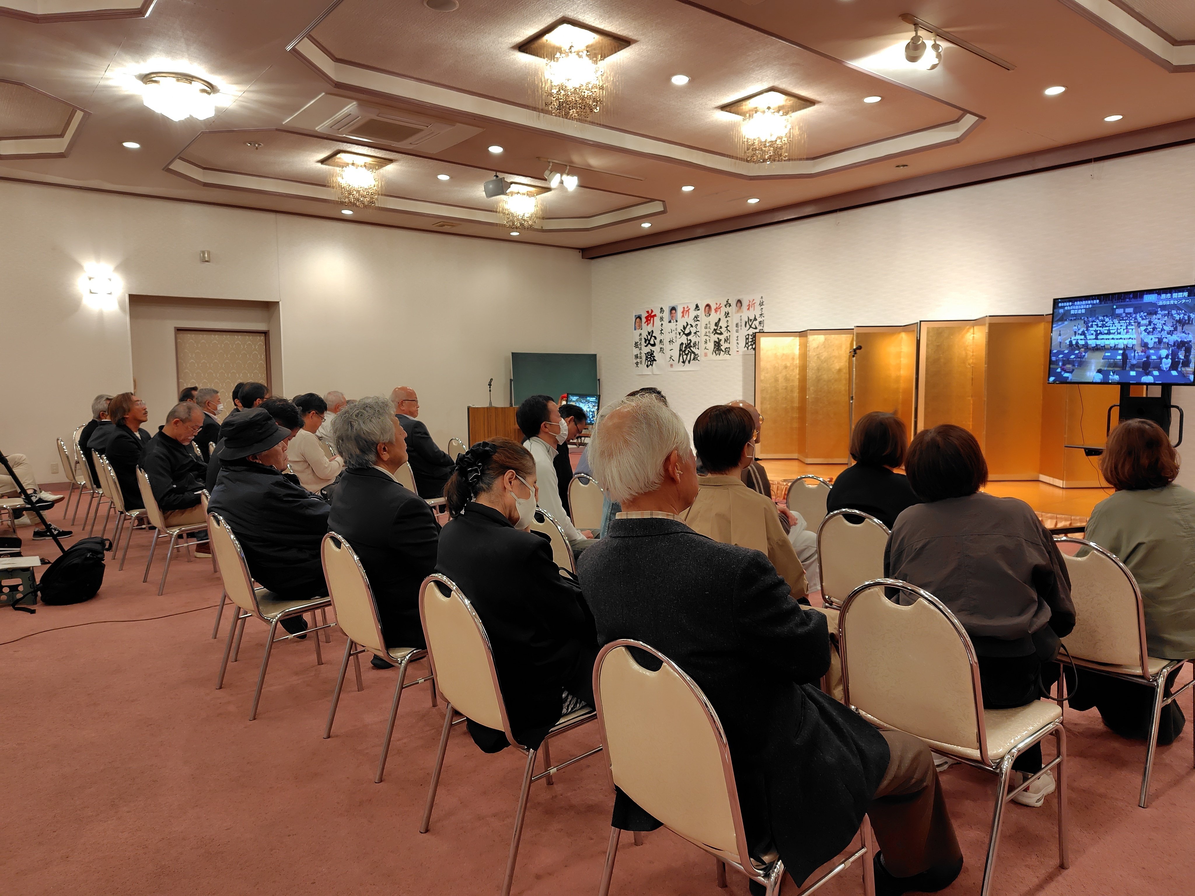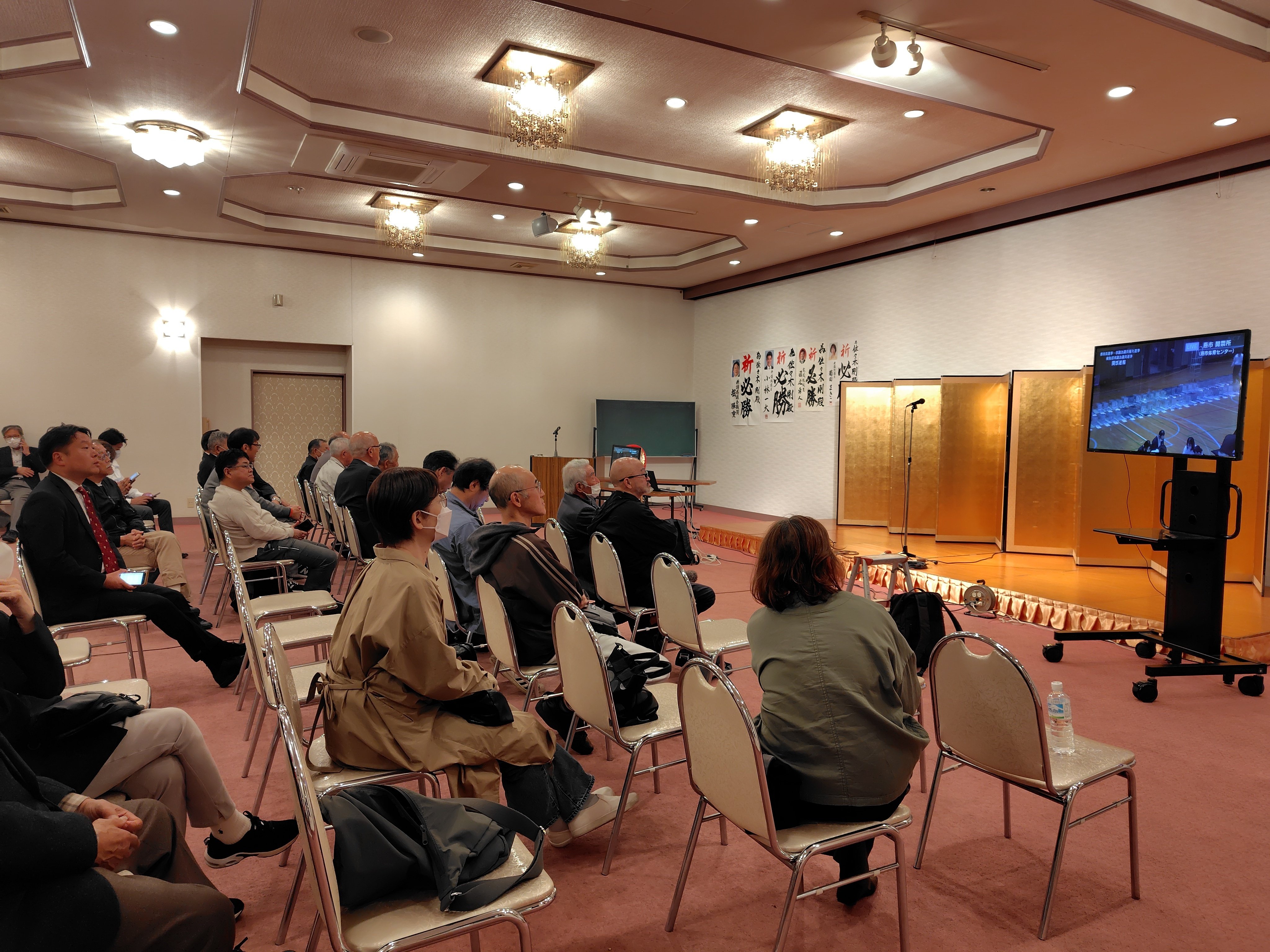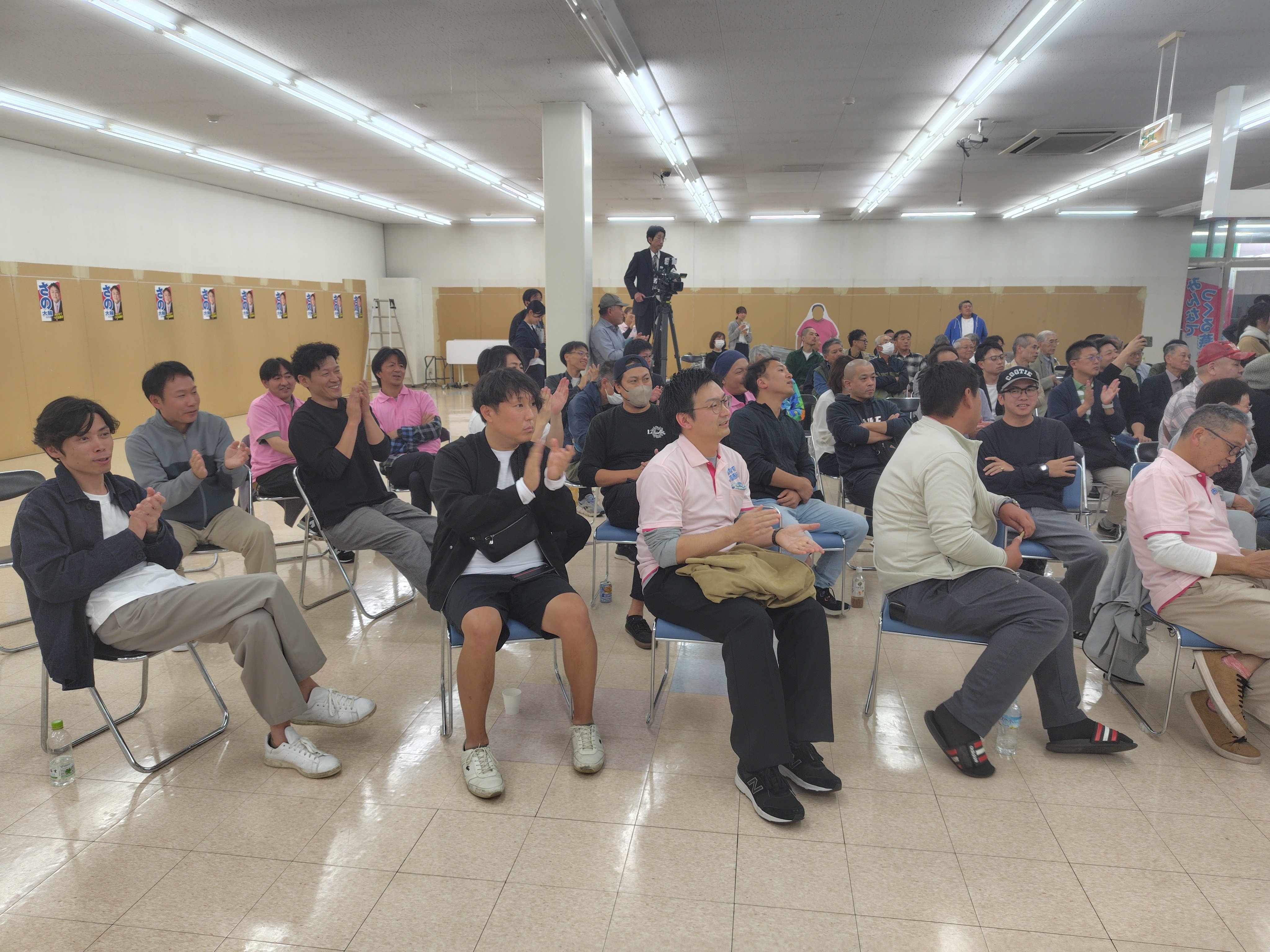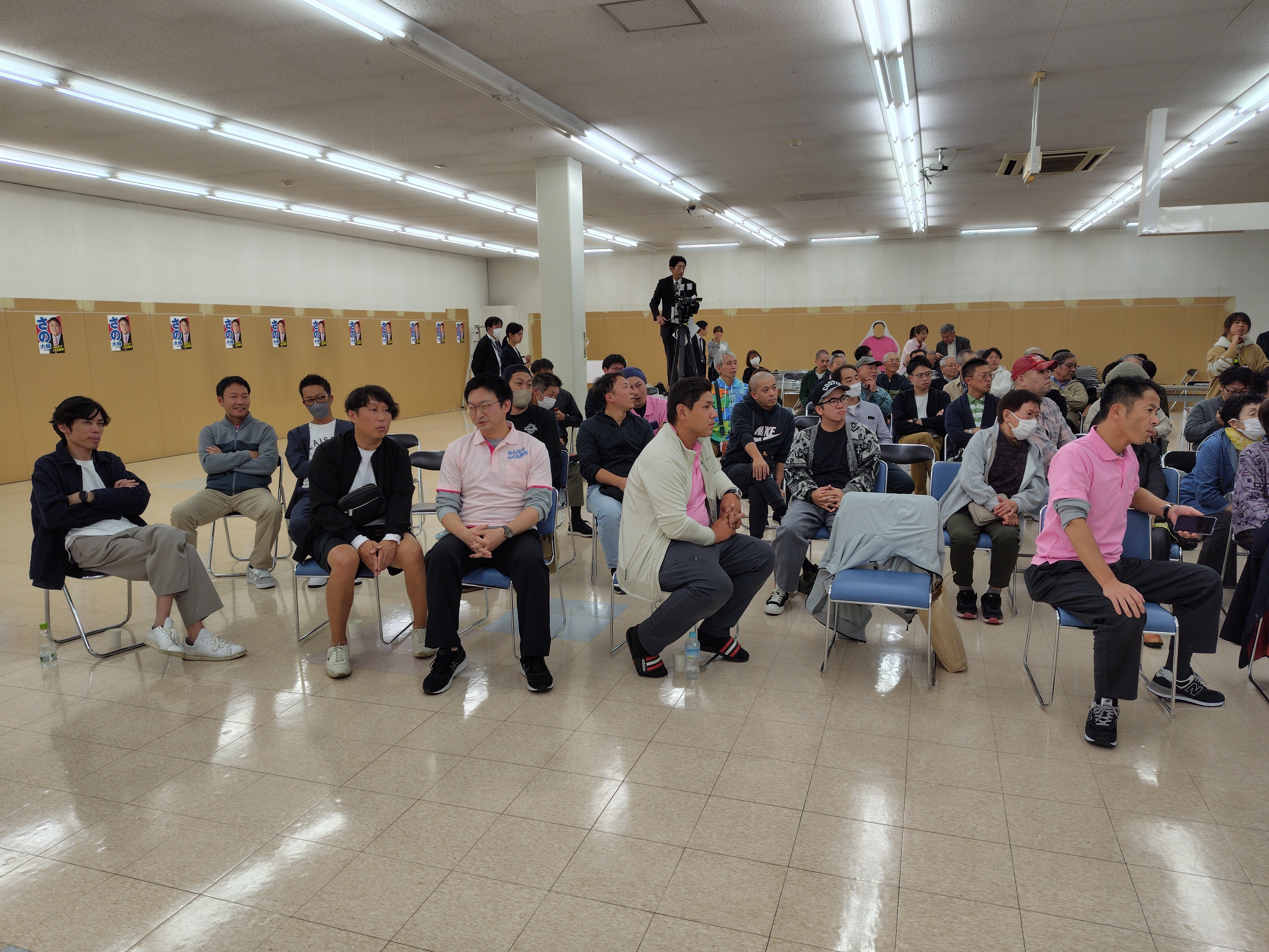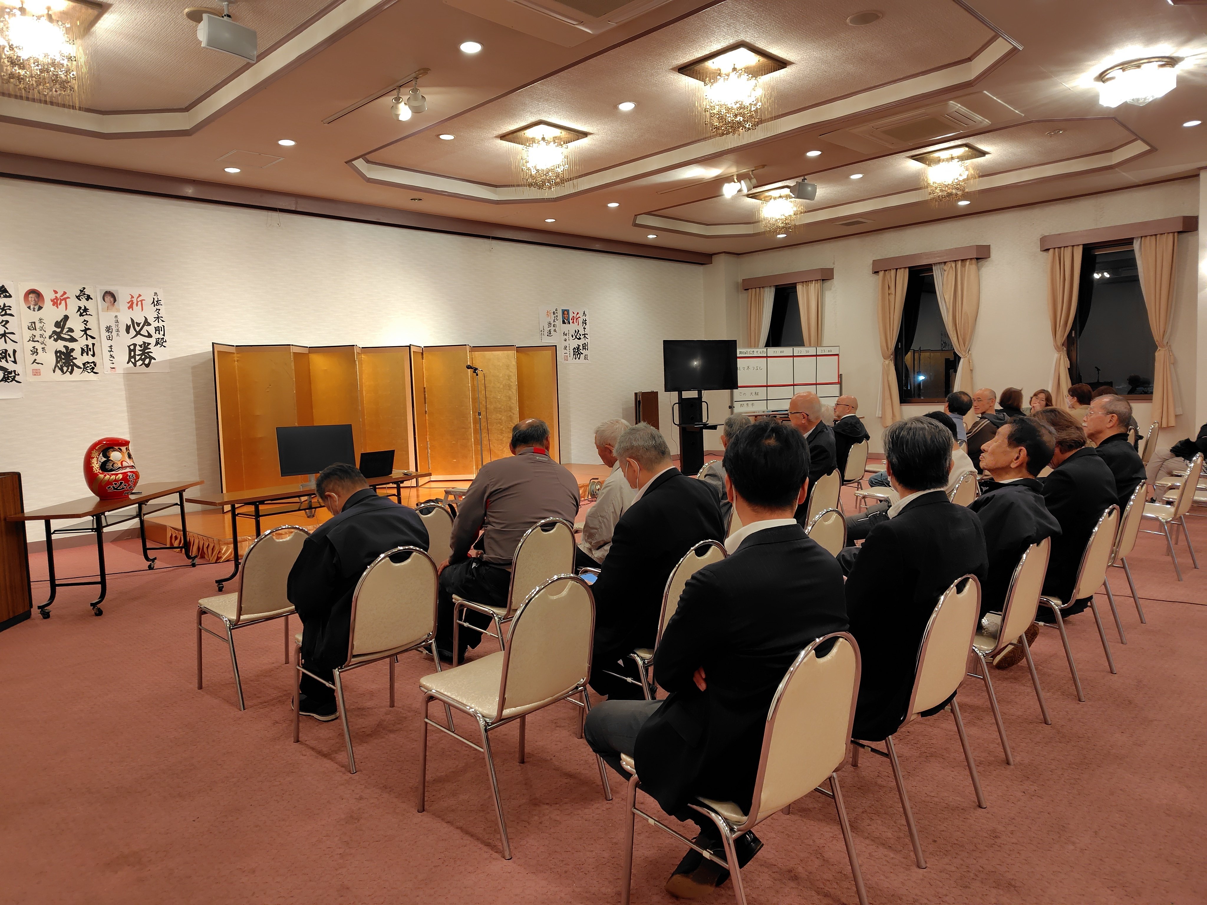 支援者ら30人ほどが席に座り、中間発表を待っています。