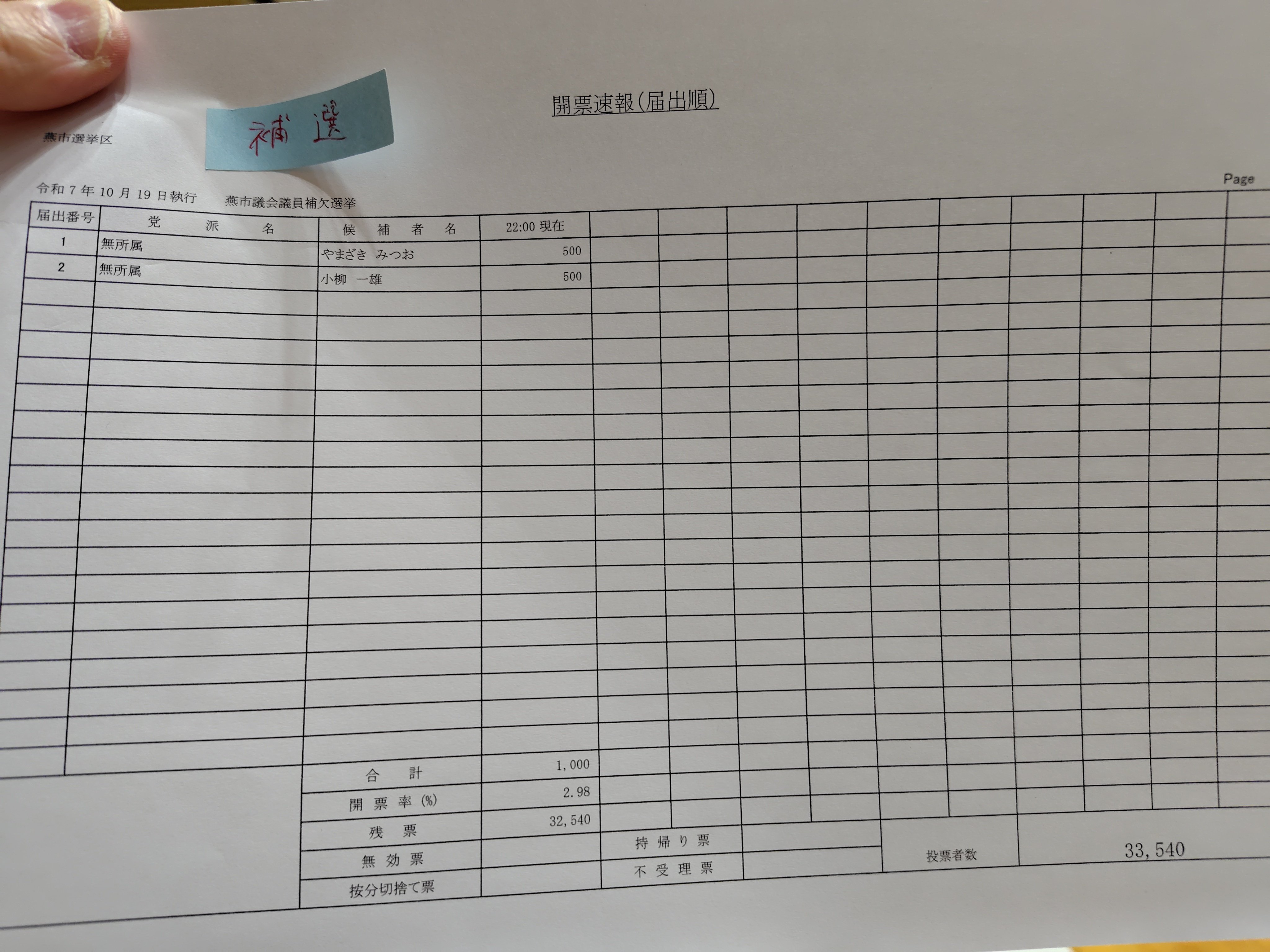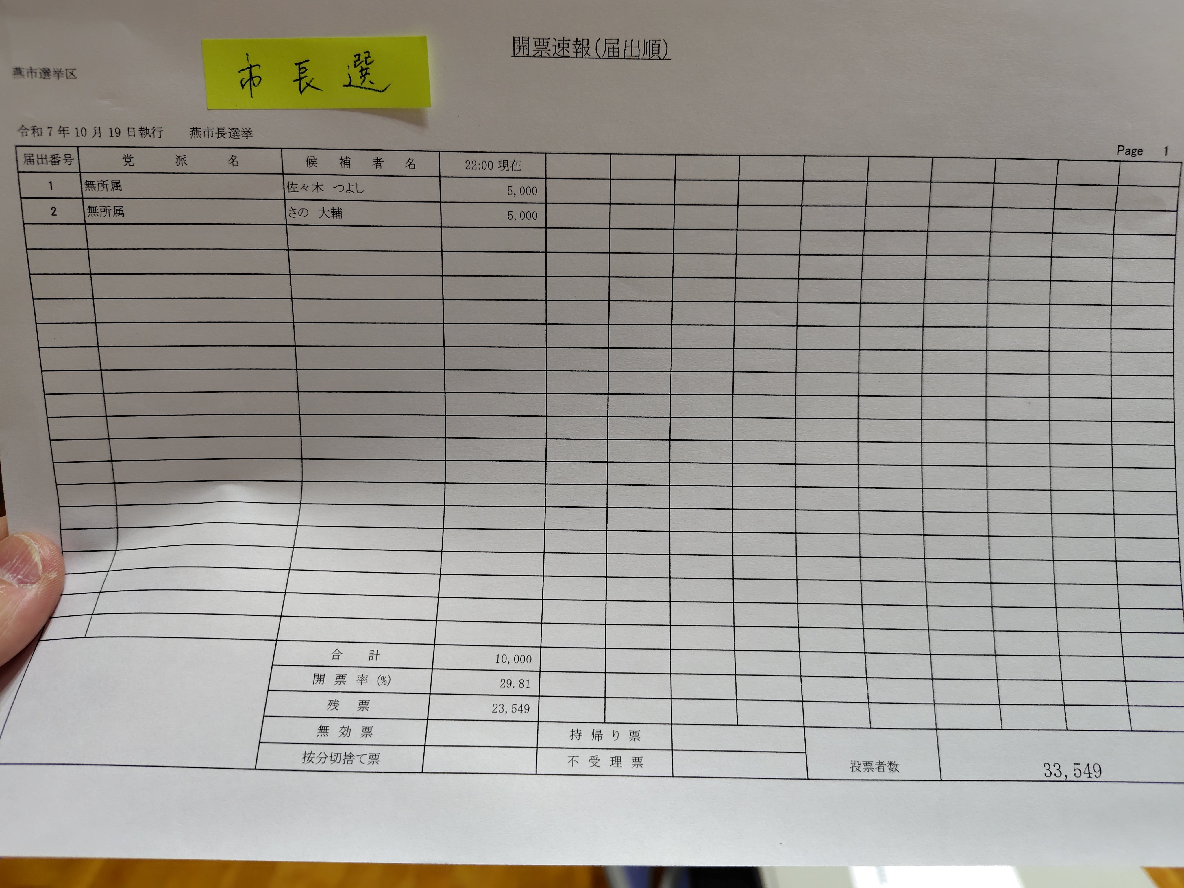 鈴木力市長の辞職(22日付)に伴う燕市長選の投開票が19日行われています。立候補したのは届け出順に、無所属新人で元会社員の佐々木剛さん(59)と、無所属新人で前市議の佐野大輔さん(41)です。新人同士の一騎打ちを制するのはどちらか?開票作業や両陣営の様子などをこちらのページで午後8時すぎから速報します。開票開始は午後9時です。