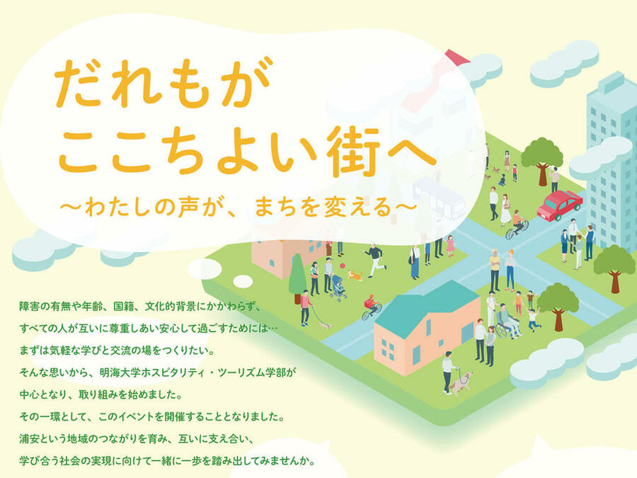 明海大学(千葉県浦安市・学長:中嶌裕)ホスピタリティ・ツーリズム学部は、地域のつながりを育み、互いに支え合い、学び合う社会の実現に向け、「だれもがここちよい街へ ~わたしの声が、まちを変える~」をテーマに、地域共創イベントを11月9日に開催する。