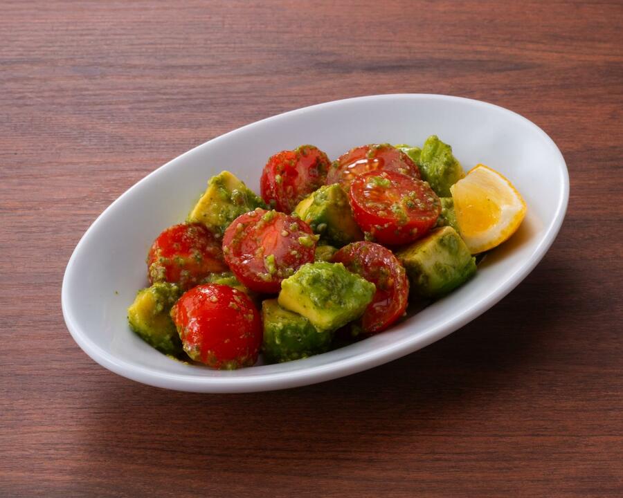 ジューシーなトマトとアボカドに、香るバジルが旨みを引き立てる“ご褒美マリネ”。付け合わせのレモンを絞って、さらにさっぱりと。