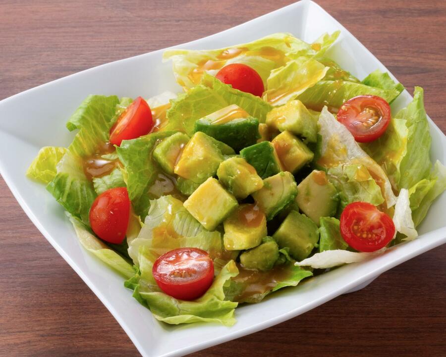 まろやかアボカドとシャキシャキ野菜。爽やかな野菜ドレッシングで、焼肉の合間に、ほっとやさしいひと口を。