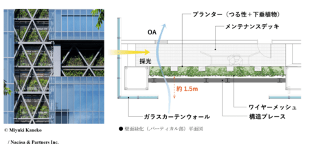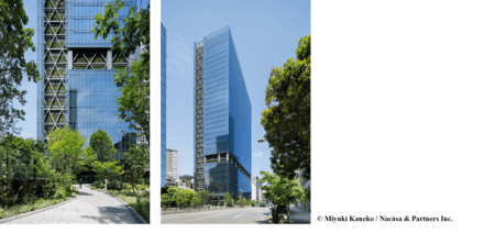 当物件は、公開空地である「森のゲート」や、輻射熱抑制と多様な植栽構成の壁面緑化を有する緑化施設を備えた高層オフィスビルで、高さ150mまで連続する壁面緑化ファサードと、意匠・構造・設備と融合した都市環境に貢献する高度な緑化技術が高く評価されました。