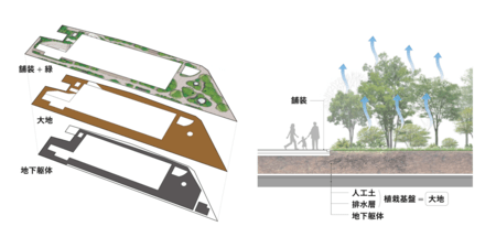 立地特性を踏まえ、まちとまちを緩やかにつなぐと共に、周辺の緑との連携を意識した圧倒的かつ多様な緑量の空間を実現し、都心にいながらも森の中にいるような安らぎを街に提供しています。さらに、グリーンインフラとしての大地と緑の形成、超高層ビルにおける壁面緑化ファサードへの挑戦、それらを恒久的に維持する管理手法の構築にも取り組んでいます。