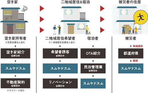 スムヤドスムが推進するプロジェクトは、地域に眠った空き家を「二地域居住者の住居」や「宿泊施設」として再生・活用することで、地域に人の流れを創出するほか、災害発生時には被災者向けの応急仮設住宅として提供し、通常時・災害時を問わず地域に貢献することを目指す空き家再生プロジェクトです。