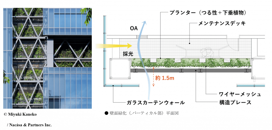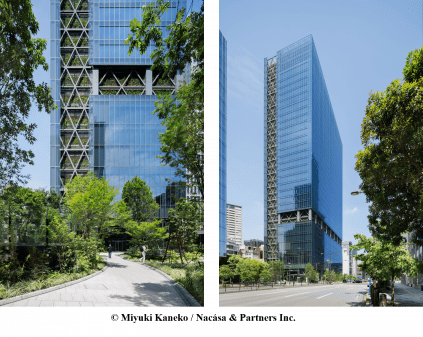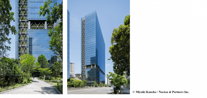 当物件は、公開空地である「森のゲート」や、輻射熱抑制と多様な植栽構成の壁面緑化を有する緑化施設を備えた高層オフィスビルで、高さ150mまで連続する壁面緑化ファサードと、意匠・構造・設備と融合した都市環境に貢献する高度な緑化技術が高く評価されました。