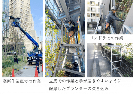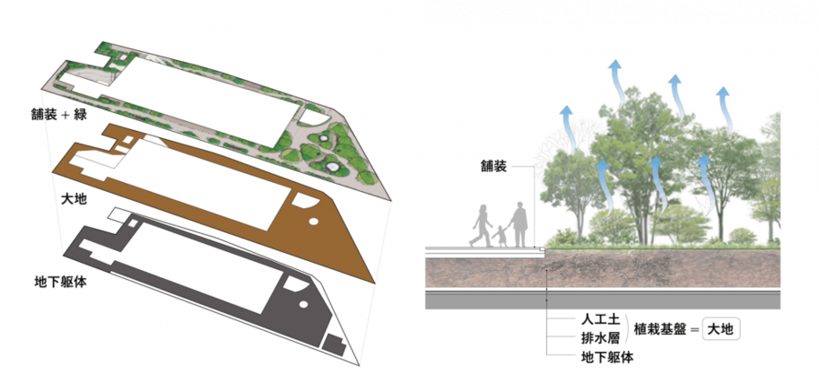 立地特性を踏まえ、まちとまちを緩やかにつなぐと共に、周辺の緑との連携を意識した圧倒的かつ多様な緑量の空間を実現し、都心にいながらも森の中にいるような安らぎを街に提供しています。さらに、グリーンインフラとしての大地と緑の形成、超高層ビルにおける壁面緑化ファサードへの挑戦、それらを恒久的に維持する管理手法の構築にも取り組んでいます。