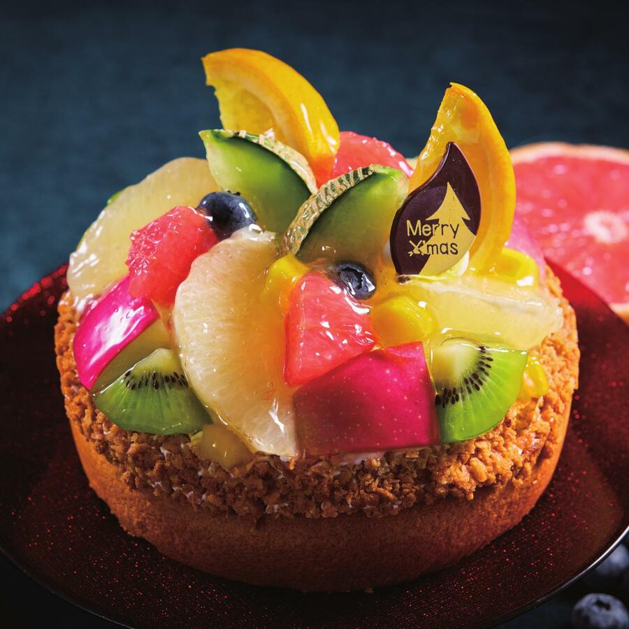 じっくり焼き上げたタルト生地に、香ばしいアーモンドスポンジと、なめらかで優しい味わいのカスタード入りホイップクリームを重ね、みずみずしいフレッシュフルーツをたっぷりと飾りつけました。フルーツの華やかで爽やかな味わいが、特別な時間をより一層輝かせます。