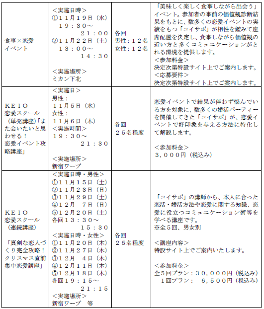 ② 10月17日(金)から、特設サイト「トキメク」にて各種恋愛支援イベントの参加者を募集。趣味や食事などの体験を通じて自然に惹かれ合うことを目指した恋愛イベントや、恋愛を学ぶ「KEIO恋愛スクール」、トータルコーディネートを行う自分磨きサポートを提供。
