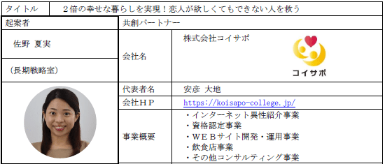① 「My turn」の2次選考通過者が、「2倍の幸せな暮らしを実現!恋人が欲しくてもできない人を救う」をテーマに、共創による事業化を目指して実証実験を開始。