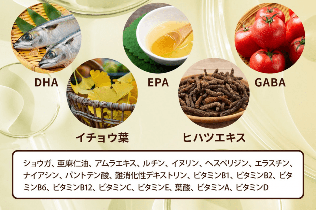 乳酸菌、DHA、ショウガ、亜麻仁油、アムラエキス、GABA、イチョウ葉、ルチン、イヌリン、ヘスペリジン、エラスチン、ナイアシン、パントテン酸、EPA、ヒハツエキス、難消化性デキストリン、ビタミンB1、ビタミンB2、ビタミンB6、ビタミンB12、ビタミンC、ビタミンE、葉酸、ビタミンA、ビタミンD