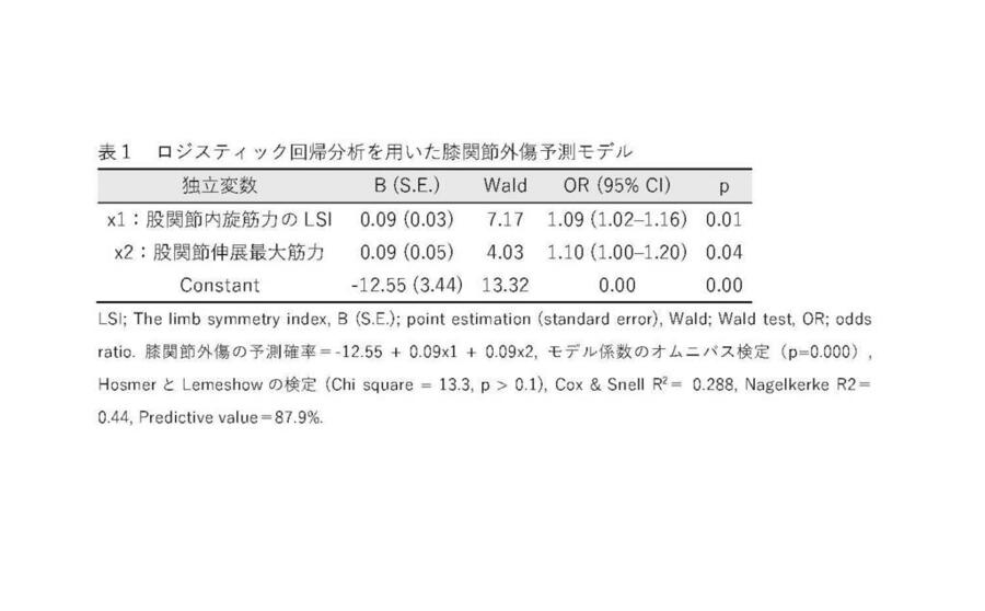 その結果、79人中58人がリスク因子の解析対象となり、1シーズンで15件(13人:うち2人が2回受傷)の膝関節外傷が生じました。発生率は0.4/1000 h(95% CI,0.2-0.5)、重症度は51 days(95% CI,0-104)、burdenは19 days/1000 h(95% CI,11-31)でした。受傷メカニズムに関しては、直接的な身体接触による受傷が、高い重症度および負担と関連していました。ロジスティック回帰分析の結果、股関節内旋筋力のLSIの高さ(OR,1.09;95% CI,1.02-1.16)と股関節伸展最大筋力の高さ(OR,1.10;95% CI,1.00-1.20)が膝関節外傷の有意なリスク因子として認められました(表1)。