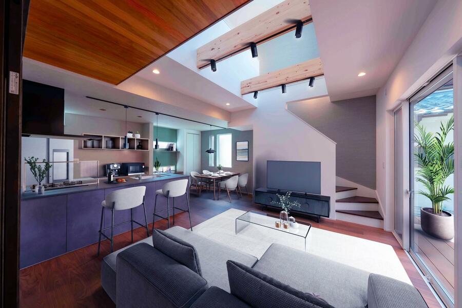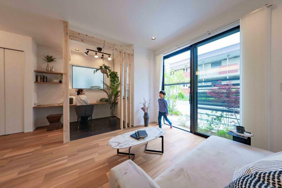 人の視線が気になる通りに面した立地条件の中、道路側からの視線を遮るデザインウォールやプライベートウォールを設け、建物に囲まれて窮屈に感じないよう植栽も目隠しとして機能するように配置しました。さらにリビング・マルチルームからフラットテラスや ウッドデッキのあるプライベート空間を家の中からも心地よく感じられるように設計し、カーテンを必要としない開放的なLDKを創出しました。また、外から直接、フラットテラス、ウッドデッキに行けるようにし、ご近所さんなどにもコミュニケーションをとりやすくなっています。