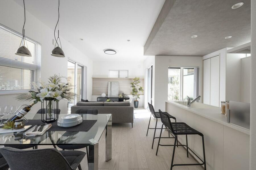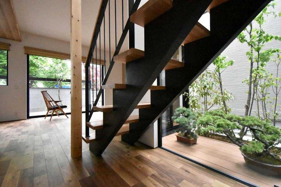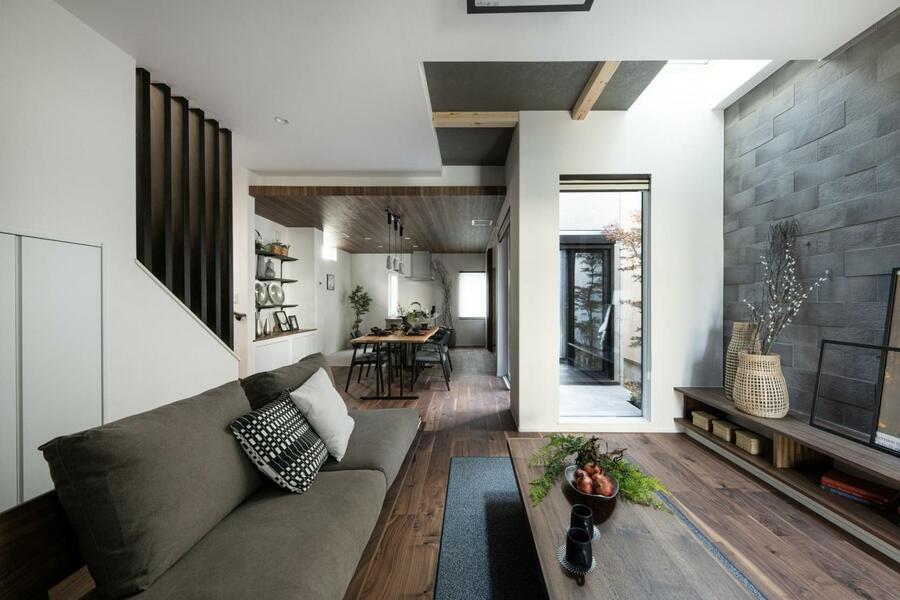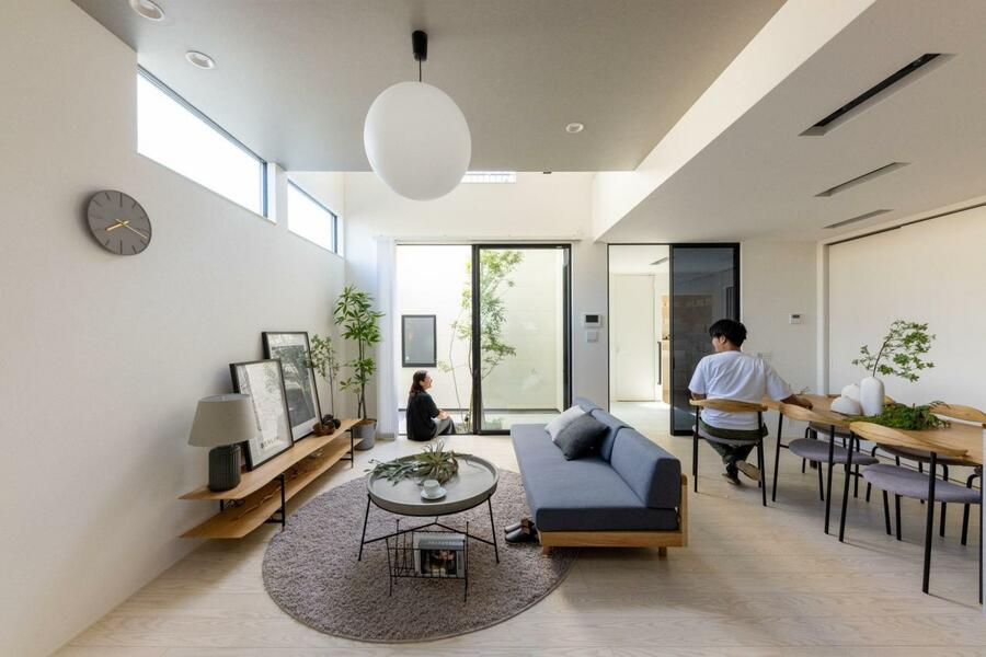 旗竿敷地が建物に囲われ、南側からの採光が難しく、視線が抜けず圧迫感が生じる課題を克服するため、従来の一般的な間取りとは異なる配置計画を採用した分譲住宅です。建物に光を取り込むため、水廻りを南側に配置し、家の中心に光を呼び込む中庭を設けました。中庭に植えられたシンボルツリーは、屋内にいながら常に緑を感じさせてくれます。また、玄関と中庭に同じタイルを使用することで、内と外の境界を曖昧にし、開放感を演出。リビングからは中庭と玄関が一望でき、自然と一体となる広々とした空間を実現しています。