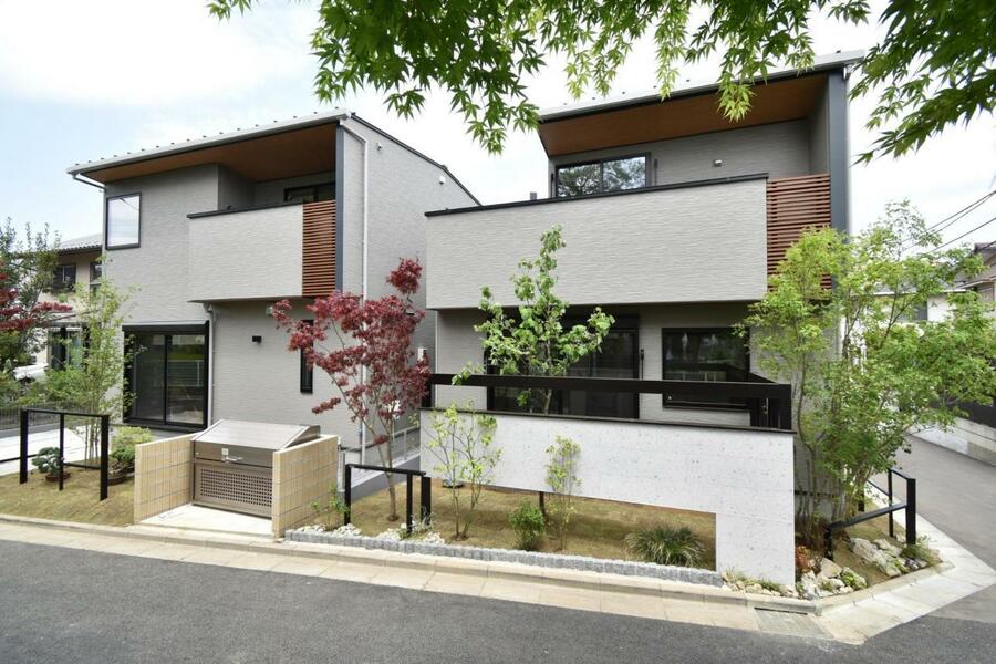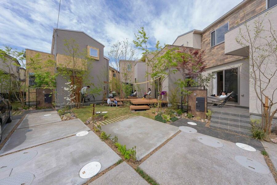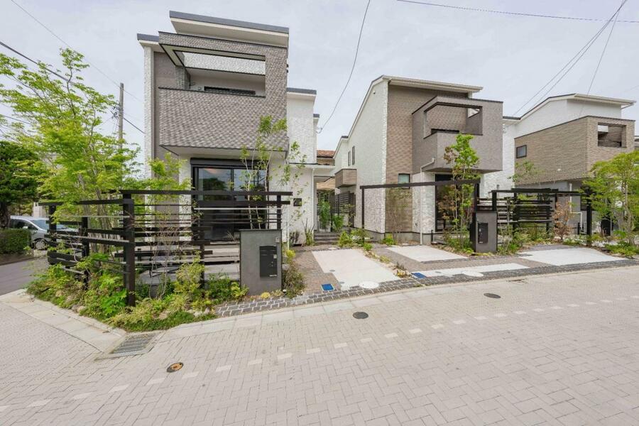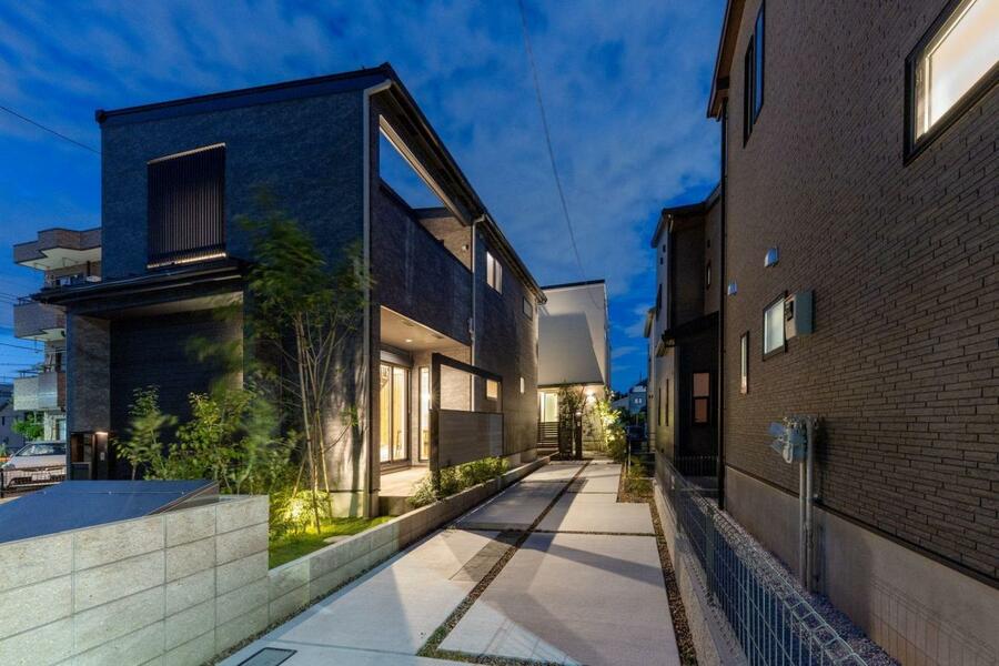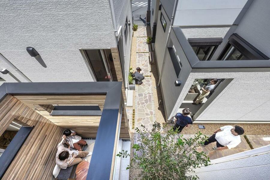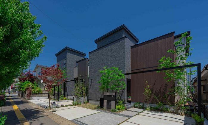 風致地区の建築条件において、建蔽率には算入されないよう 2階を跳ねだし軒下空間をつくった全5棟の分譲住宅です。後退部分を活用した外部空間をデザインし、空間を感覚的に領域分けする閾(いき)として門型フレームを設置しました。周囲を柔らかく覆う雑木を配し、居場所がウチからソトへグラデーションのように染み出していく住まいです。