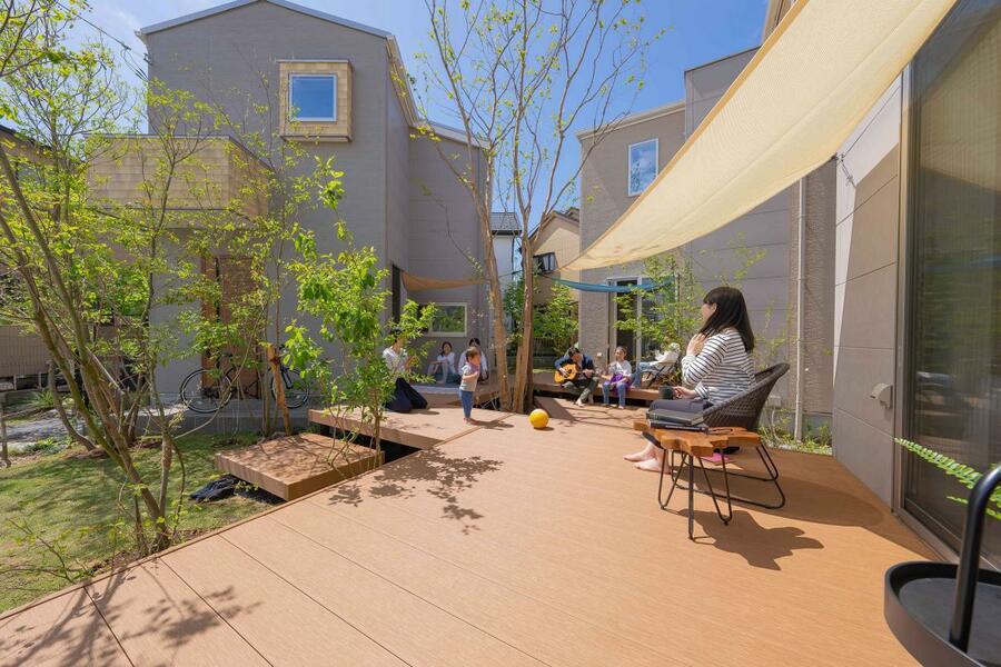 子どもが思う存分遊びまわれるコミュニティゾーン「セントラルデッキ」と、子どもも大人も一息つけるプライベートゾーン「休息の庭」を設け、入居後に適度な距離感を保ちながら子どもを通じて交流を育んでいけるようなデザインとしました。「セントラルデッキ」には、シンボルツリーとともにタープを取り付けられるポールを設置。ポールには、鯉のぼりを始めとする季節のイベントに因んだ装飾を取り付けることも可能で、子どもの好奇心を刺激します。さらに、ウッドデッキにはあえて段差を設け、基礎体力や安全に対する認識能力の向上を促しています。