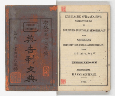 津山藩医宇田川家第4代宇田川興斎が江戸で刊行。ヴェルガーニ原著『簡約英文法』蘭語版第2版(1853)のタイトルページから英作文の第17課(Zeventiende opstel.)末尾(p. 106)までを整版で復刻。