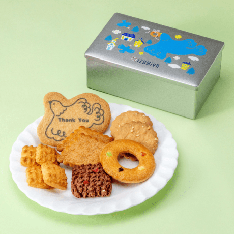 京王の包装紙の「ハト」をモチーフにしたデザイン缶にリングダーツやハト型プリントクッキーなど詰合せた京王限定販売商品です。