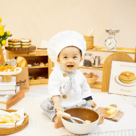 コックコート衣装とこだわりの小物でパン屋さんに大変身。お子様のかわいい瞬間を残せる、とっておきの撮影会です。