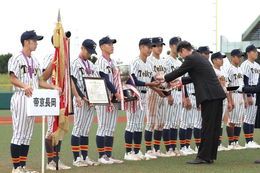 表彰式で賞状や優勝旗を受け取った帝京長岡の主将鈴木祥大ら=富山市民球場