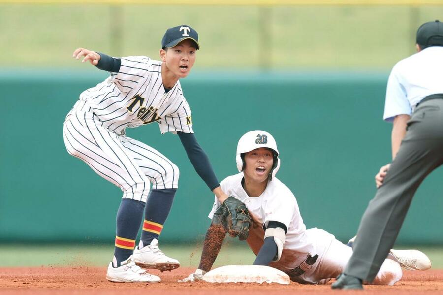 2回帝京長岡無死一塁、1走松山海皐が盗塁を試みるがタッチアウト。日本文理の遊撃手吉田流太=富山市民球場