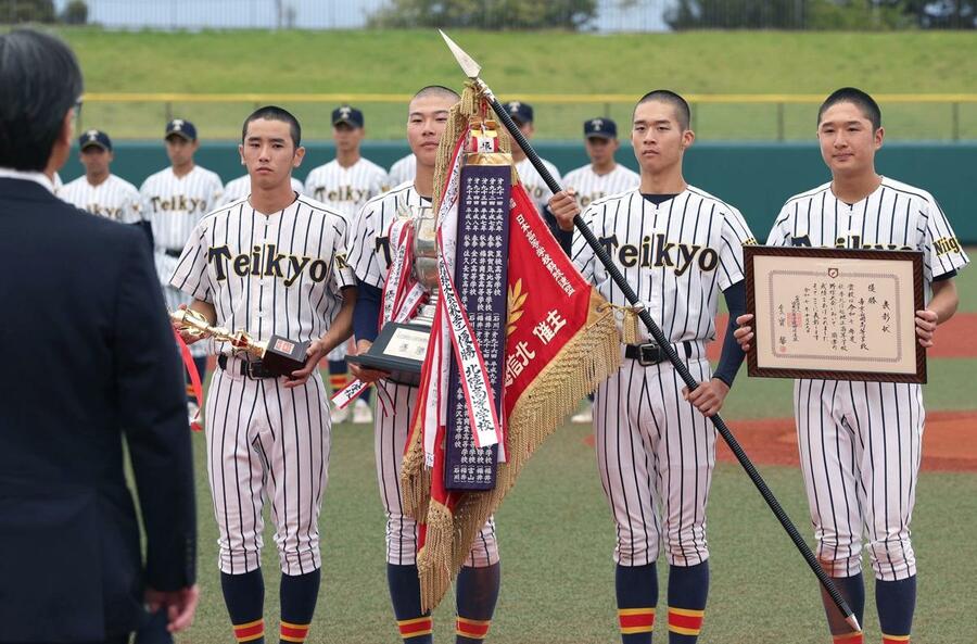 表彰式で賞状とトロフィーを受け取った日本文理の主将渡部倖成ら=富山市民球場